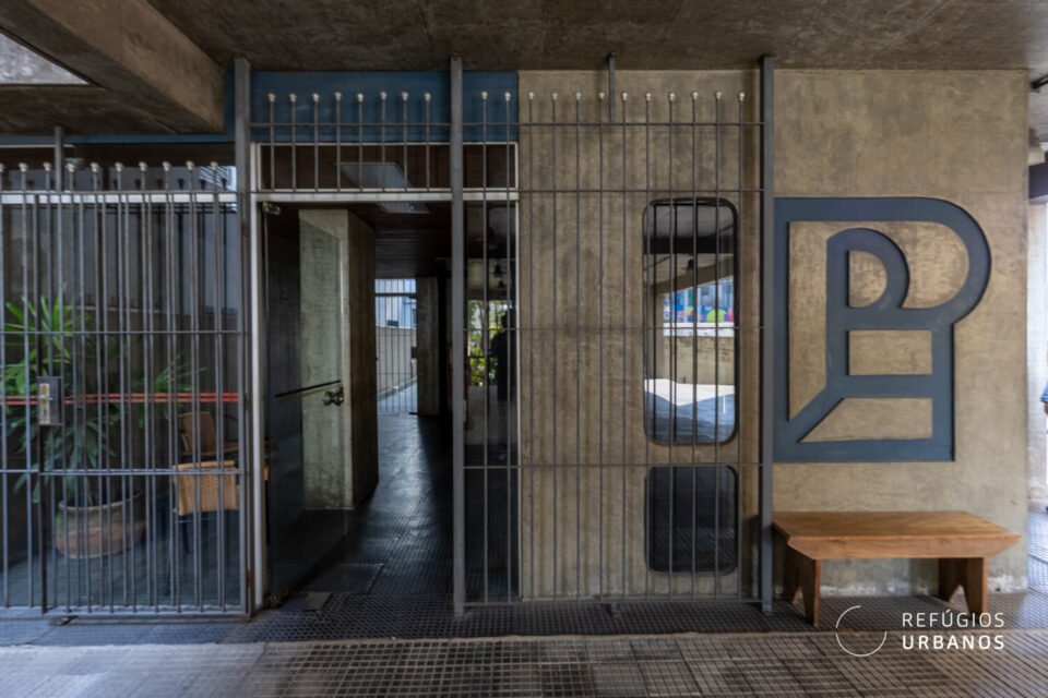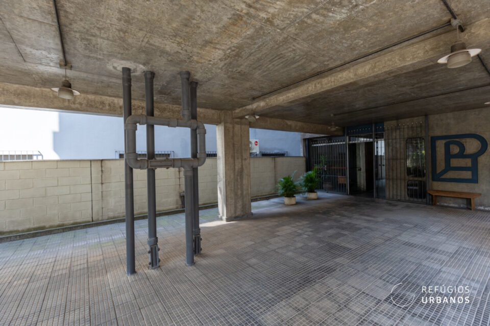 A fachada brutalista em alvenaria exposta tom claro, as faixas de concreto aparente marcando cada pavimento e a escadaria com degraus amarelos e corrimão azul criam uma identidade visual marcante. Construído em 1978 e com autoria até hoje desconhecida, o Pedrasmil carrega aquela solidez que prédio novo simplesmente não tem como reproduzir. Um prato cheio para os amantes de arquitetura. Vamos entrar?