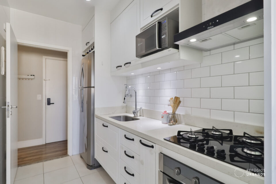 Logo na entrada, temos acesso à cozinha/área de serviço: moderna, aconchegante, clean e repleta de armários.