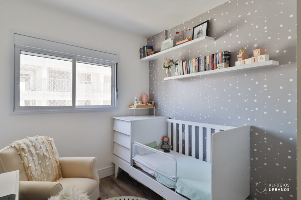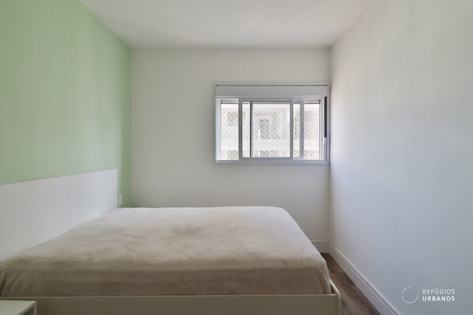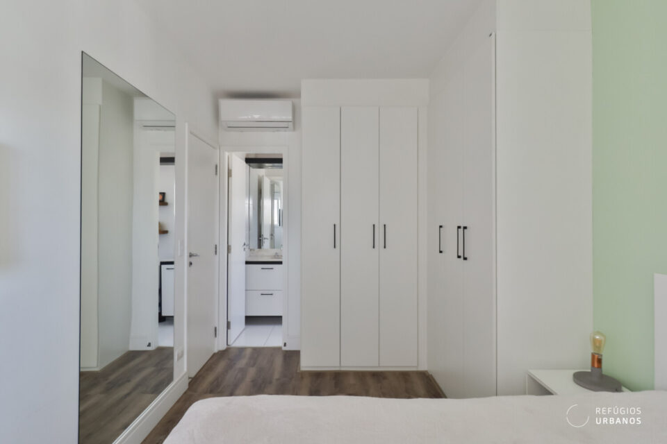 Na área íntima, temos dois quartos. O primeiro, hoje, é o quarto do bebê/escritório e é atendido por um banheiro completo. O segundo é a suíte, que oferece conforto e privacidade, amplos armários, ar condicionado, dimensões generosas e um banheiro com ventilação natural.
