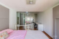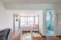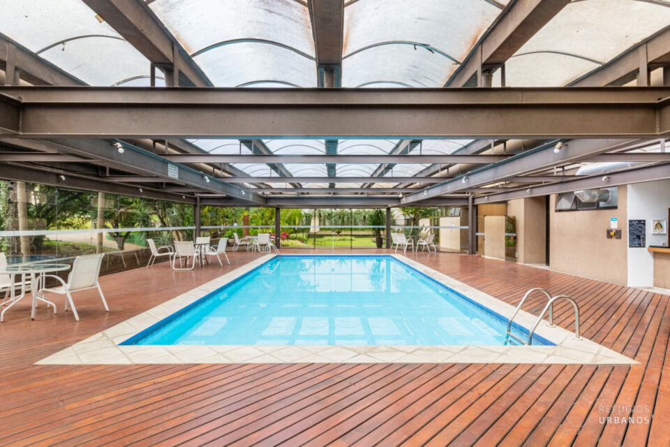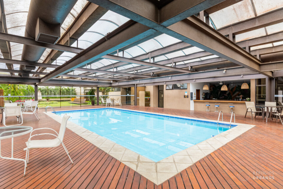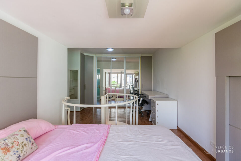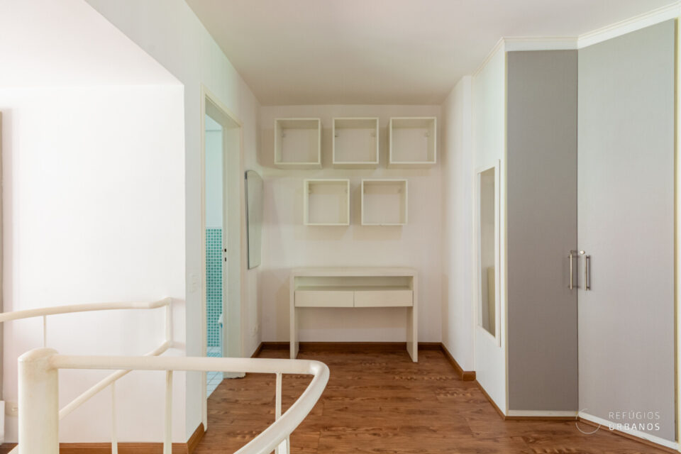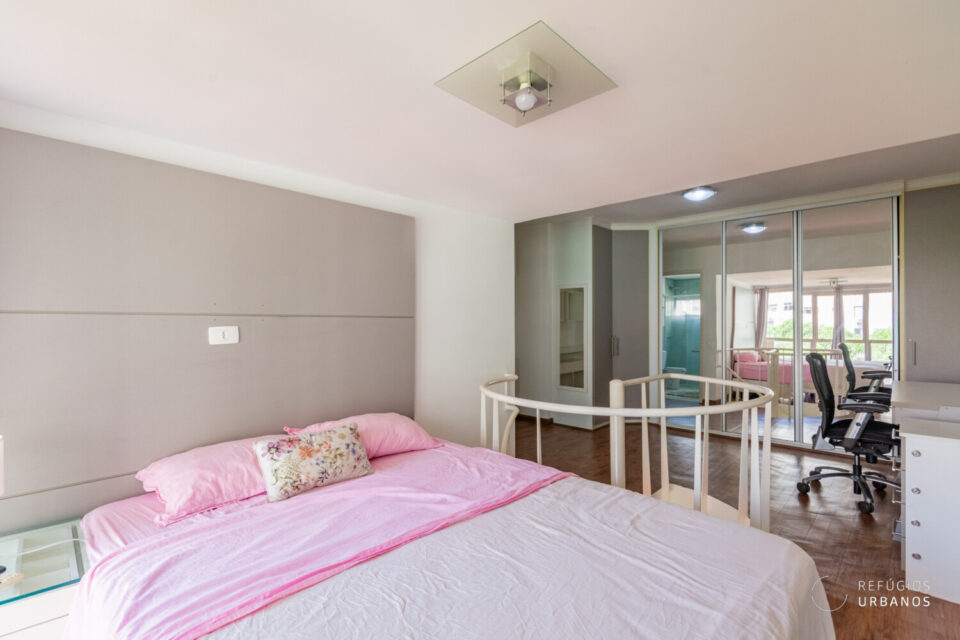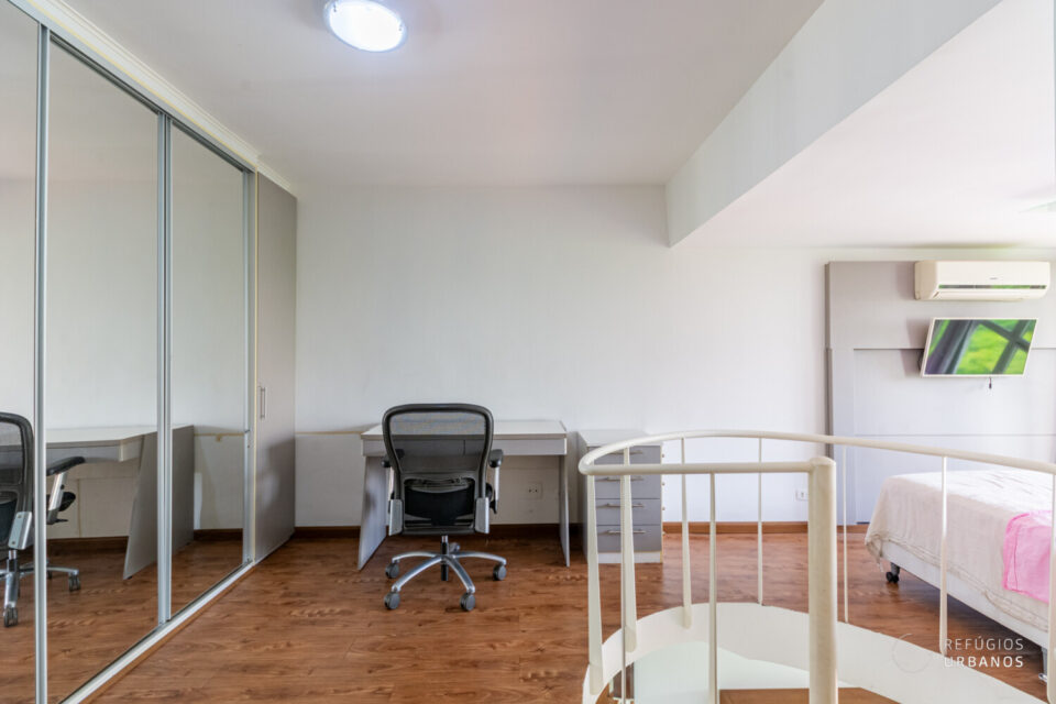 O piso superior abriga a suíte principal: um verdadeiro refúgio privativo, com closet generoso, ar condicionado, espaço para home office e banheiro espaçoso. Por fim, o ambiente é silencioso, acolhedor e a janela piso-teto oferece vista privilegiada.