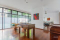 No piso inferior, a área social integra sala de jantar e sala de estar; a varanda traz muita luminosidade ao ambiente, além de criar uma atmosfera de aconchego e o canto perfeito para relaxar.