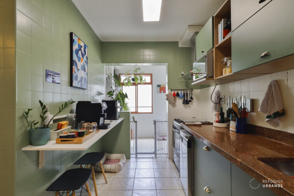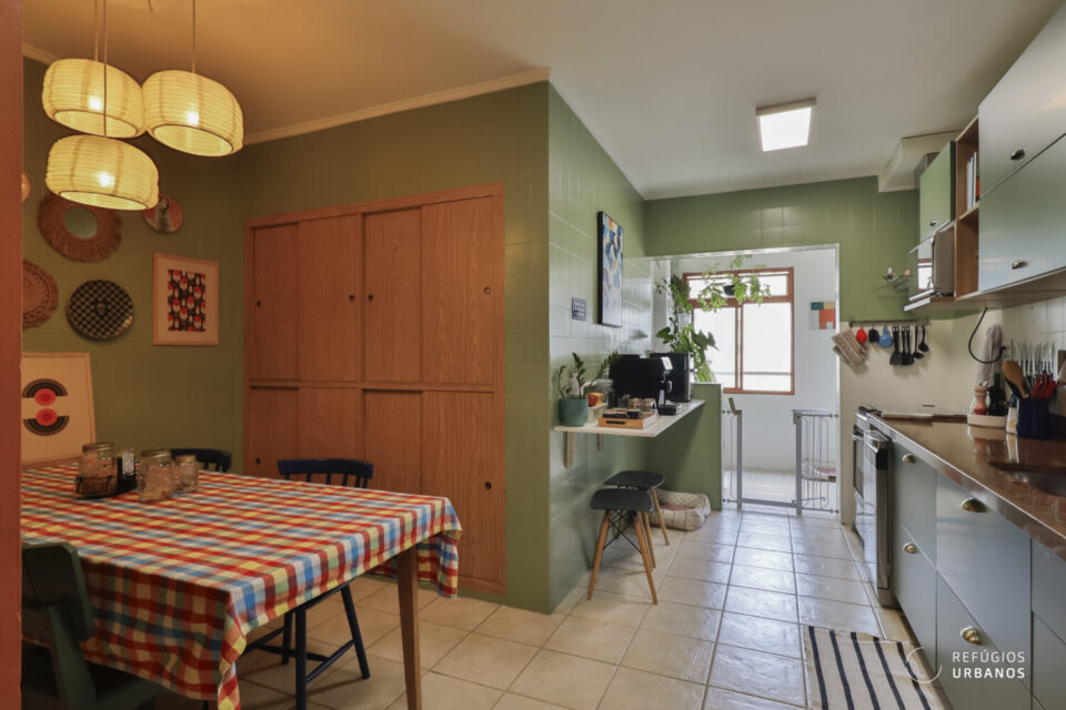 Sua cozinha é grande, com espaço para sala de jantar integrada, sem recorrer aos modismos da hora.