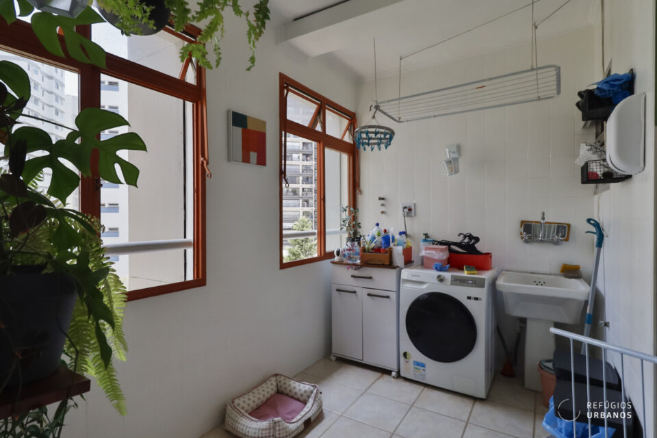 Na espaçosa área de serviços, encontramos, além da lavanderia propriamente dita, um pequeno quarto e mais um banheiro.