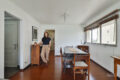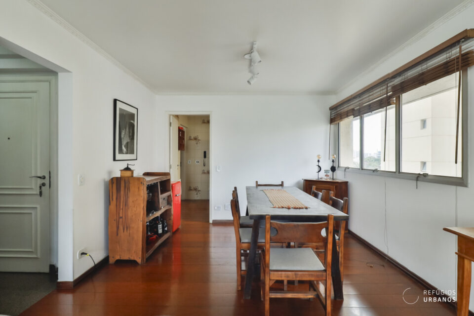 Ao lado da sala de jantar, a cozinha está hoje reservada, mas conta com janela, garantindo boa iluminação e ventilação natural. Caso haja interesse, é possível integrar os ambientes, criando maior fluidez e ampliando a área social; uma solução especialmente interessante para quem gosta de cozinhar e receber amigos e familiares, transformando esse conjunto em uma agradável área de convivência dentro do apartamento.