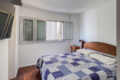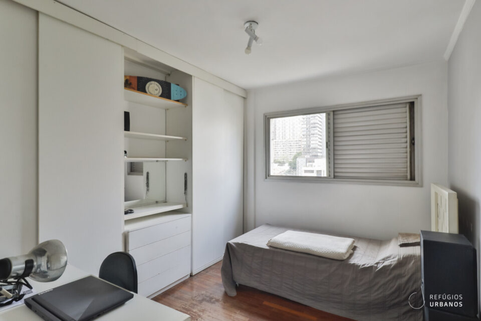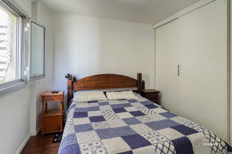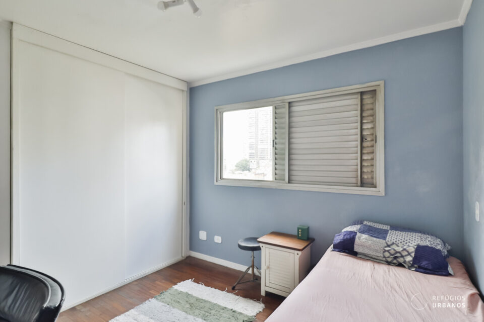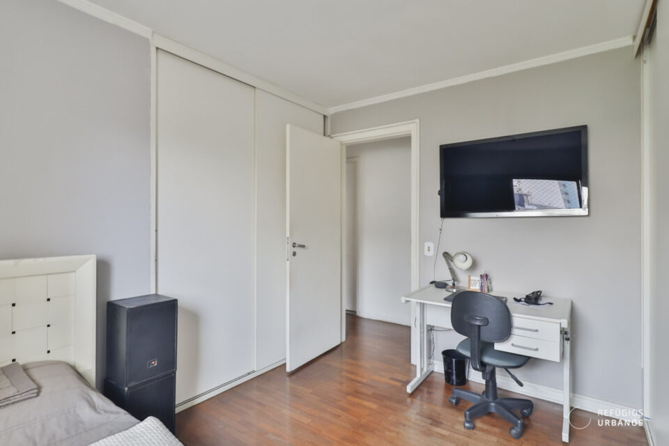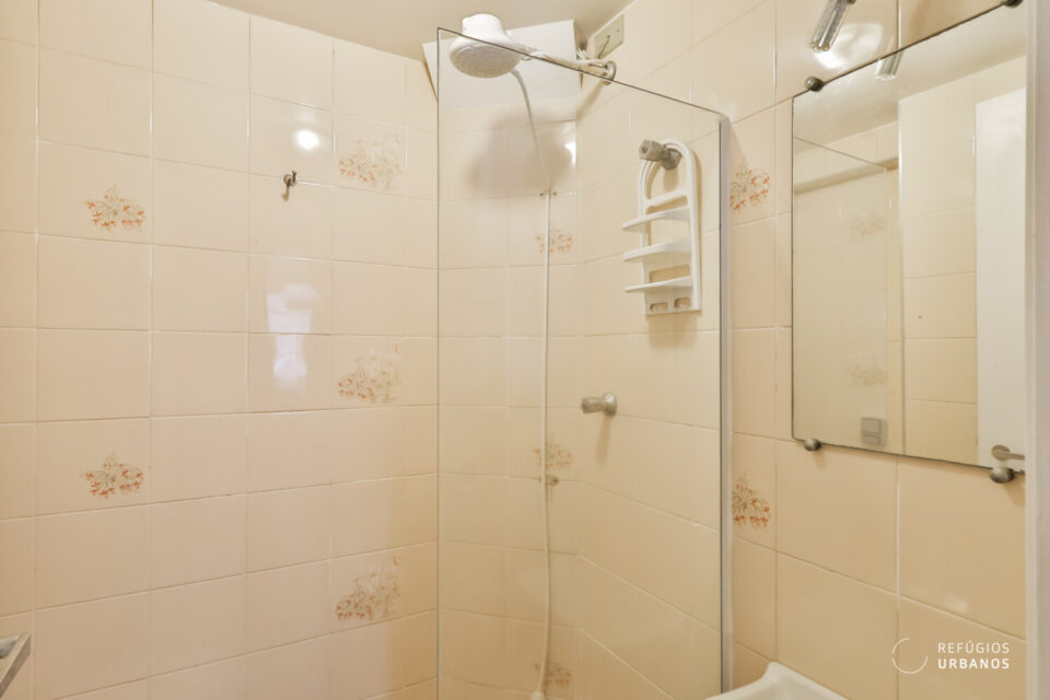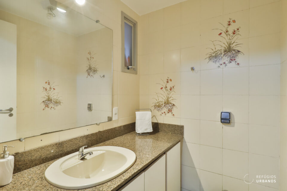 São três dormitórios, todos confortáveis e com armários embutidos. Entre eles, a suíte se destaca pelo banheiro, que preserva azulejos incríveis dos anos 80, criados em conjunto com a marca Valentino: um detalhe cheio de personalidade e charme.