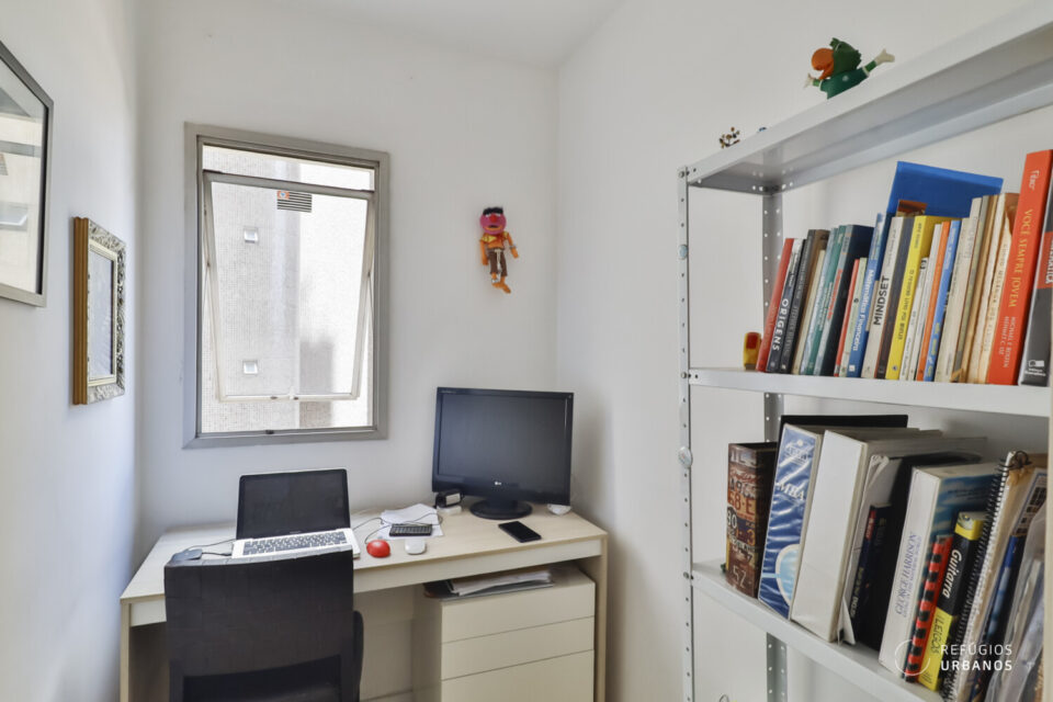 Além disso, a área de serviço faz uma conexão funcional entre os setores do apartamento. O apartamento conta com um espaço extra entre a área íntima e a área de serviço, que hoje é utilizado como escritório, mas também pode ser adaptado para ampliar o espaço de armazenamento ou atender a outras necessidades do dia a dia.