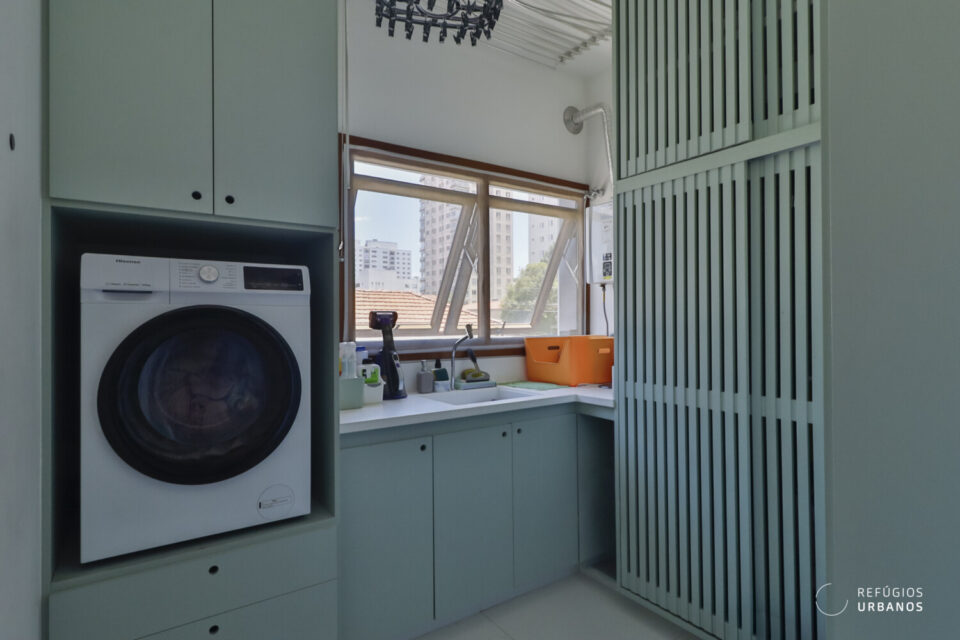 Seguindo pelo corredor, encontramos um lavabo, que atende as visitas, e a lavanderia. Que aliás, além de ampla, é recheada de armários. Mais adiante, temos a área íntima com as duas suítes. Ambas possuem um ótimo espaço, uma delas com closet.