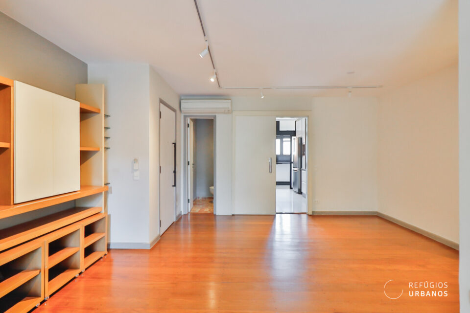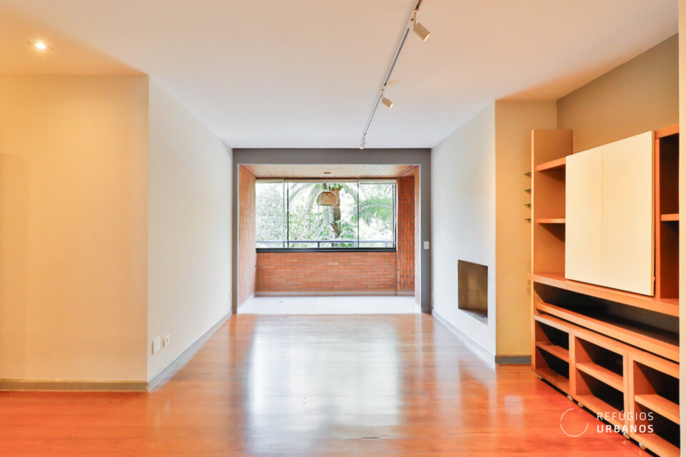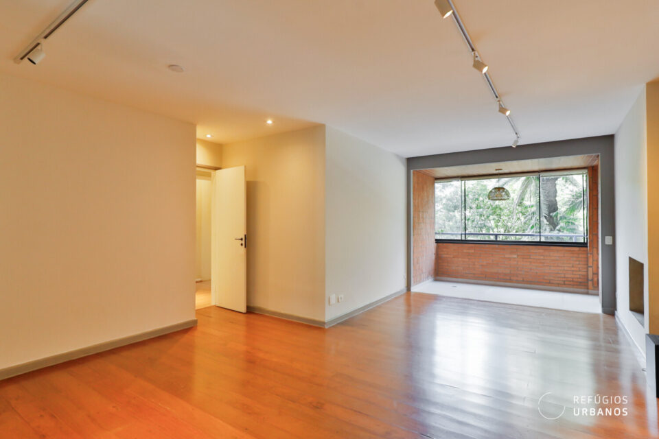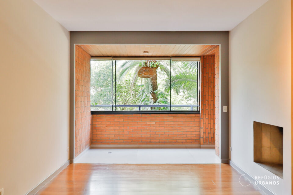 Antes de mais nada, a amplitude chama a atenção neste apartamento com três quartos. A sala é dividida em dois ambientes fluidos: estar com lareira e sala de jantar. Além disso, temos ainda a varanda integrada e banhada pelo sol da manhã. O piso de madeira corrida percorre todo o espaço social, trazendo aconchego e um charme que só o tempo sabe construir.