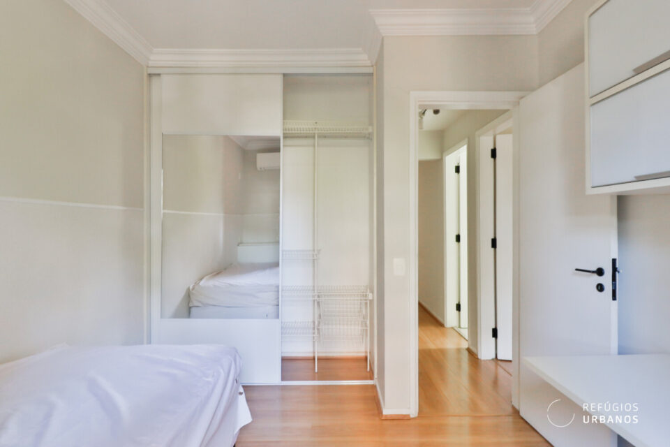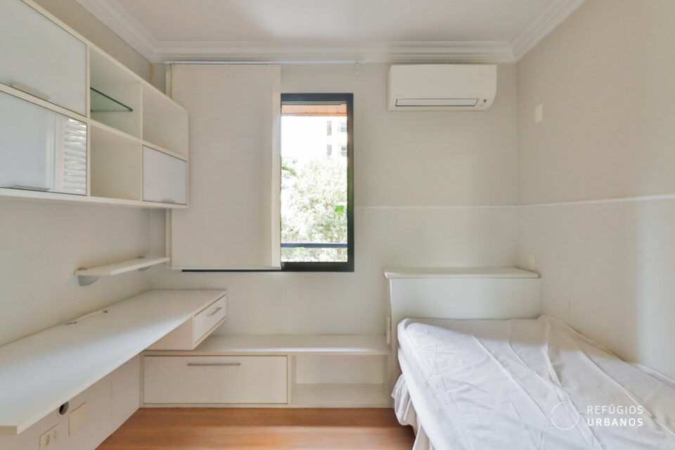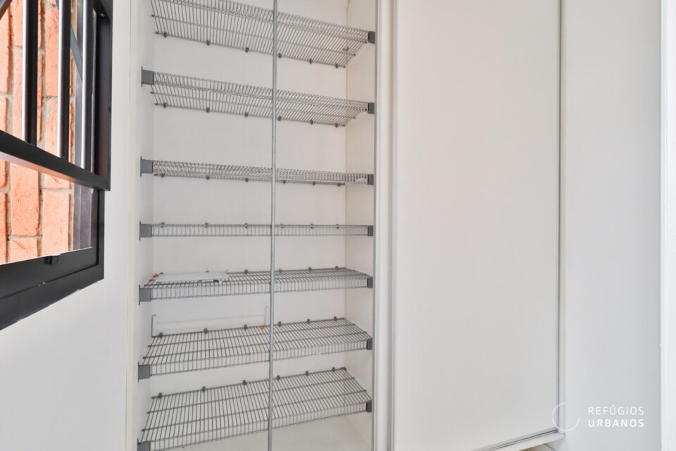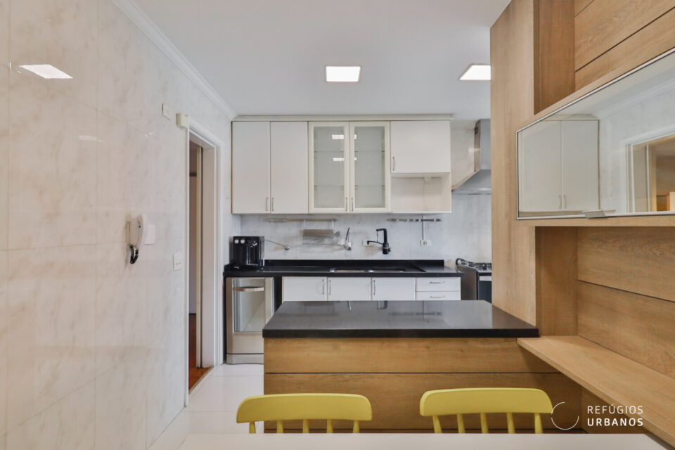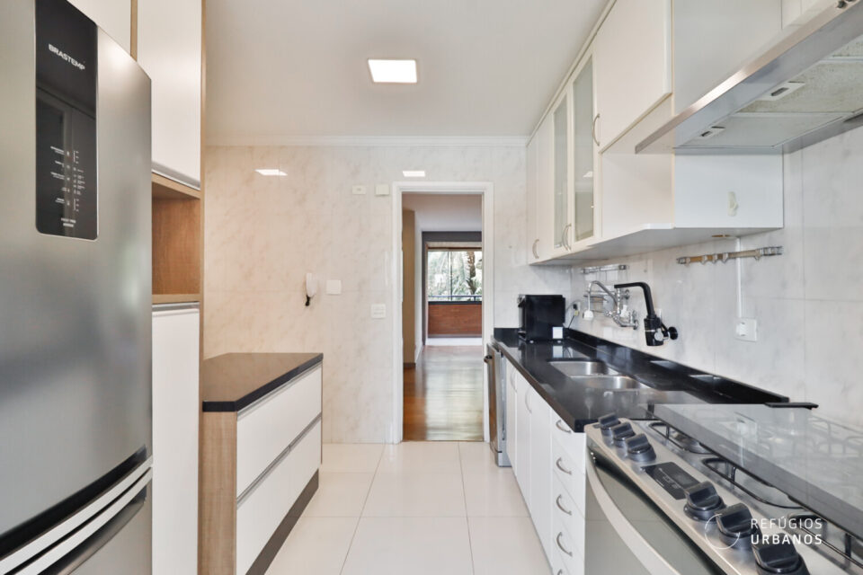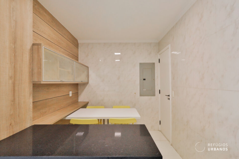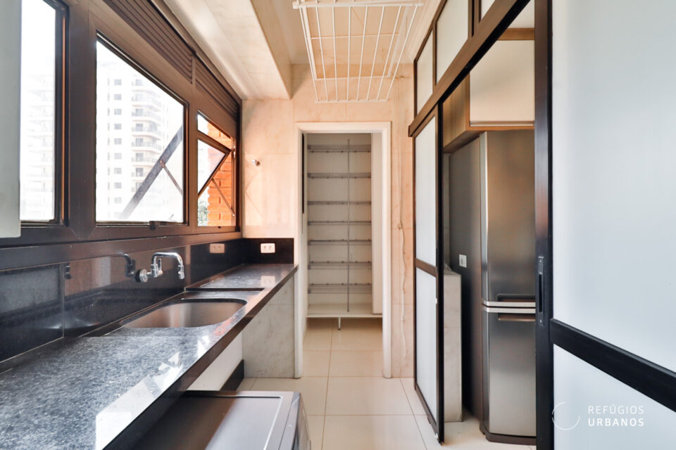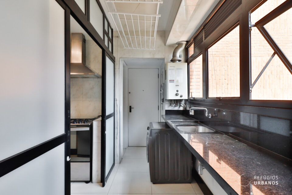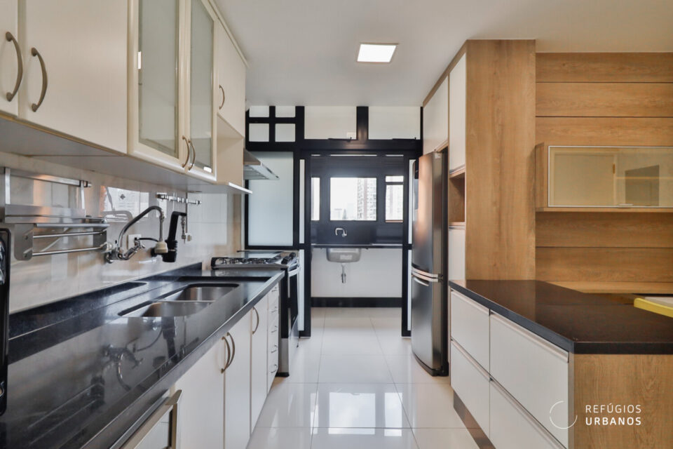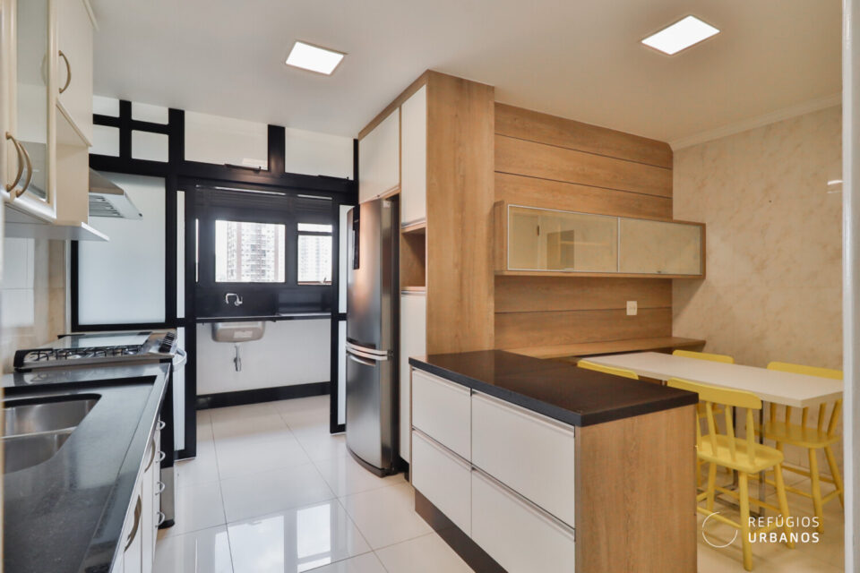 De volta à sala, a cozinha se apresenta bem resolvida com espaço para copa e passagem para a área íntima. Para quem gosta de receber, pode ser facilmente integrada à sala, o layout convida a isso. A área de serviço, com janelão que traz o sol da tarde, é clara, ventilada e conta ainda com banheiro e quarto. Aliás, o espaço pode ser incorporado à suíte e ser um closet ou home office.