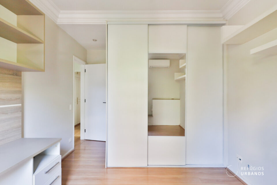 São três dormitórios com bom tamanho. Os dois quartos do corredor, igualmente, recebem o sol da manhã. Ambos com armários planejados e aproveitamento generoso. O banheiro social é amplo o suficiente para atender os dois quartos com conforto e tem ventilação natural.