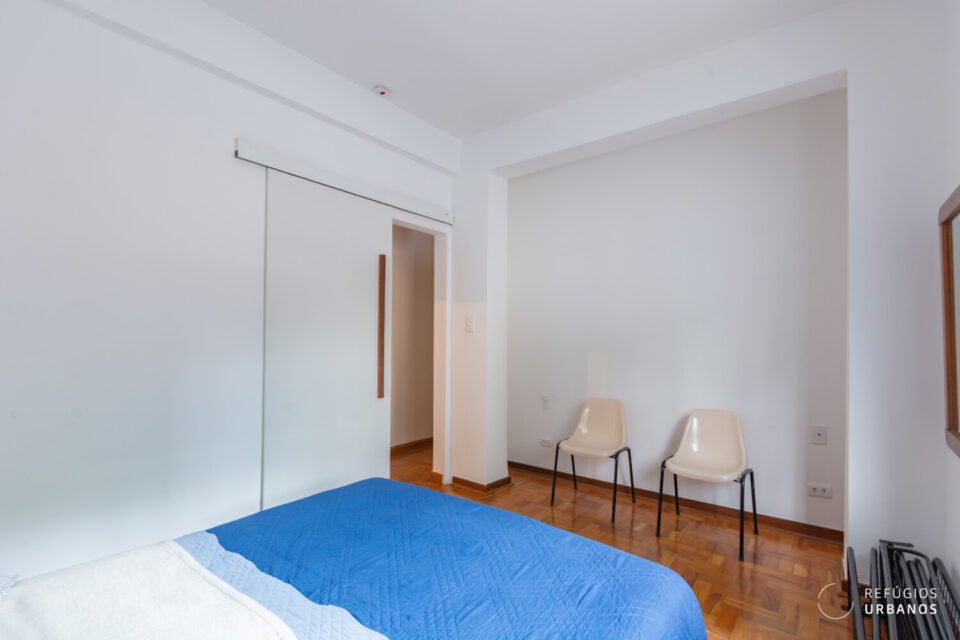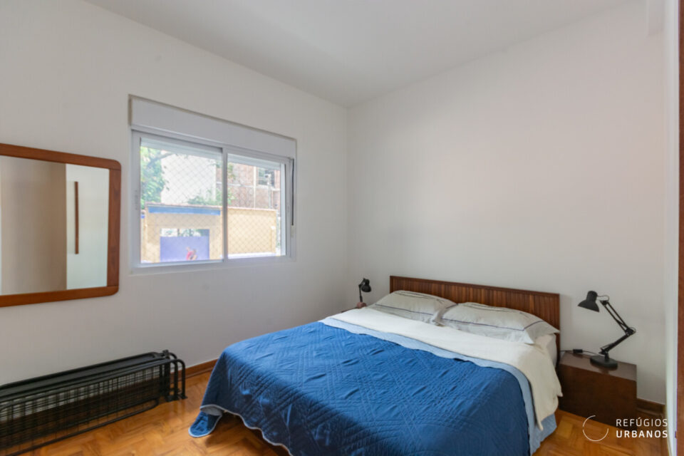 Um corredor nos leva até a área íntima, na qual quartos, sendo um deles uma suíte. Ambos com piso em tacos de madeira, e assim como a sala, o ponto que nos chama a atenção é a vista acolhedora que temos para a copas das árvores. Somado a isso, vale destacar que também temos um banheiro completo nessa área.