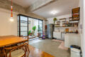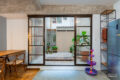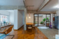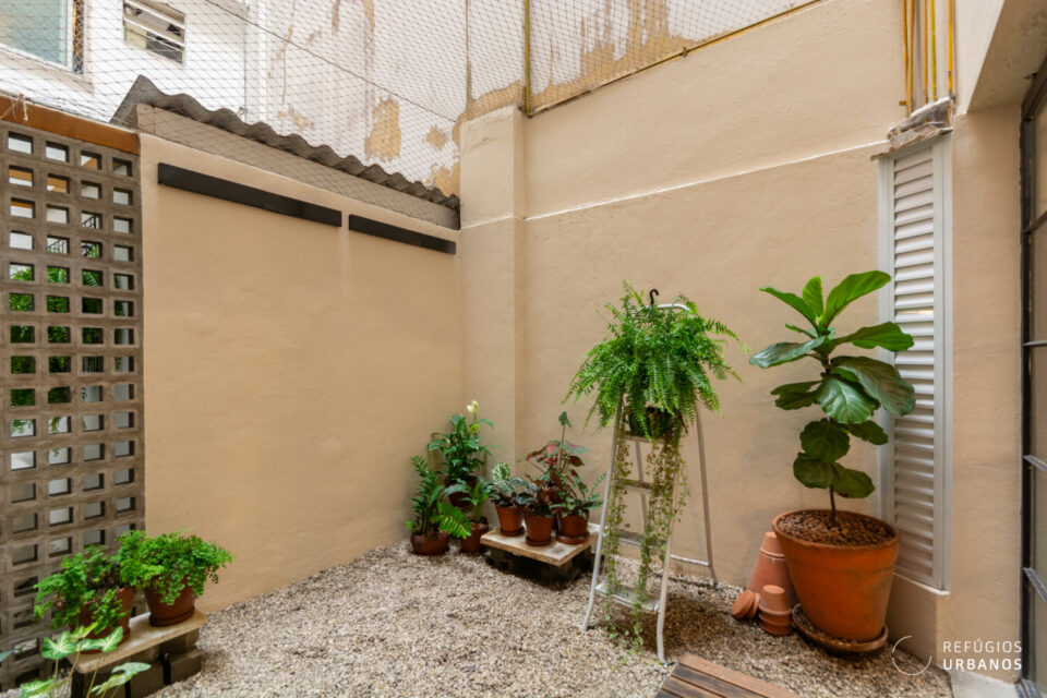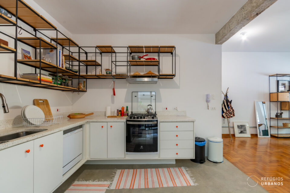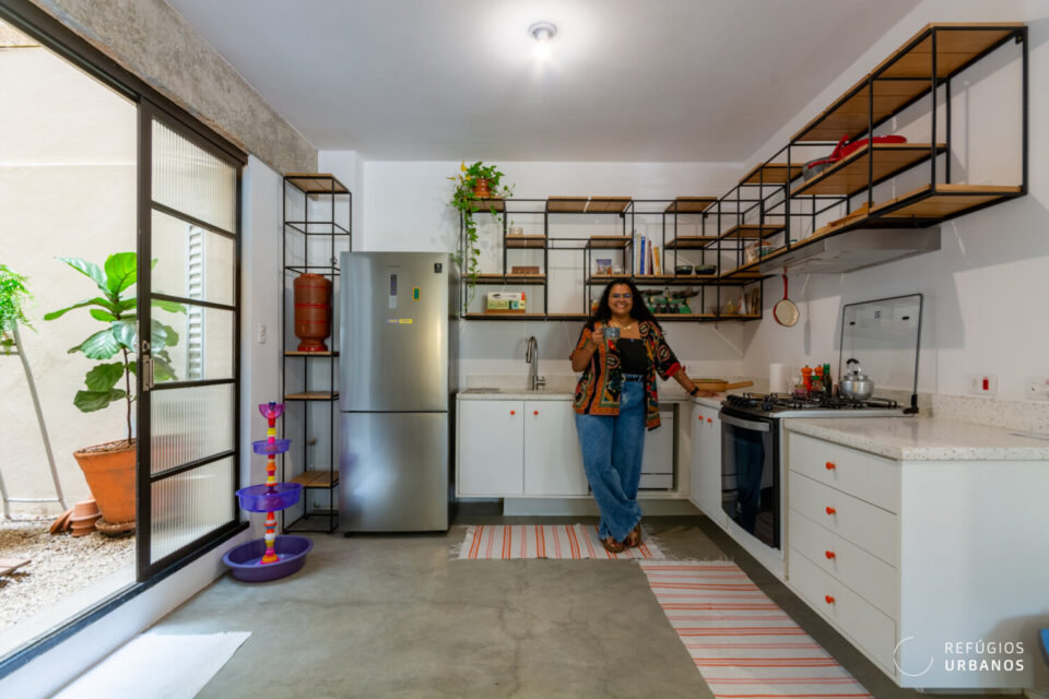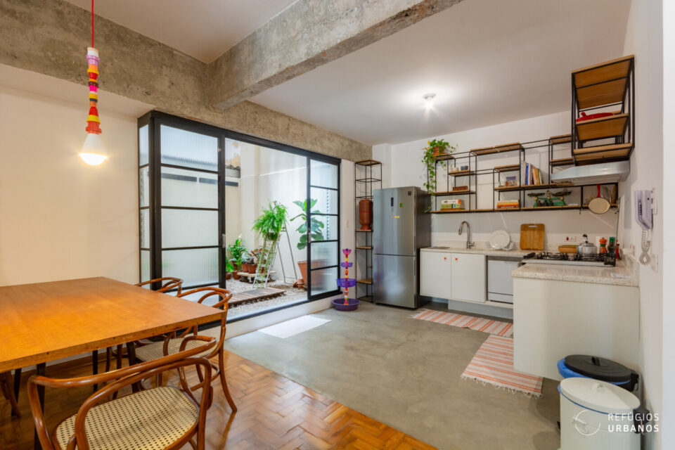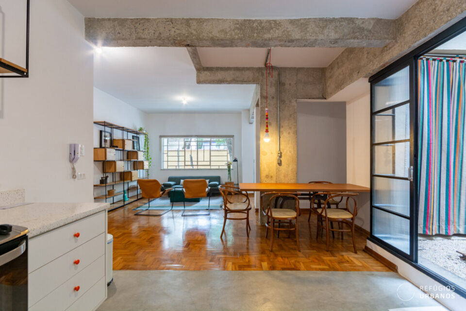 Sala de jantar e estar se integram à cozinha. Esses ambientes conversam por meio do piso de tacos em madeira, restaurado na reforma. Além disso, temos um quintal com acesso pela cozinha é simplesmente incrível, com espaço gostoso para ter plantinhas e colocar uma rede para aproveitar um momento de leitura. Vale ressaltar que a cozinha está equipada com marcenaria, fogão, forno e lava louças. As torneiras contam com aquecimento a gás.