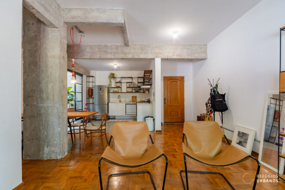 São 80 m² de área útil muito bem distribuídos. Logo na entrada, a sala ganhou muita amplitude com a integração de um dos quartos, proporcionando, dessa forma, ambientes de sala de estar e um espaço confortável e aconchegante para home office. E, assim, você pode também facilmente reverter esse espaço para um segundo dormitório, como era originalmente.