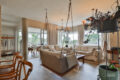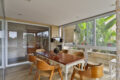 Logo na entrada social, notamos a abundância de luz natural, já que a sala é toda envidraçada e conectada com a varanda, de onde se vê o pôr do sol. Aliás, a área externa contorna todo o imóvel, de forma que todos os cômodos têm portas para o lado de fora. Pois é, essa é mesmo uma casa suspensa!