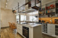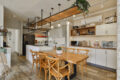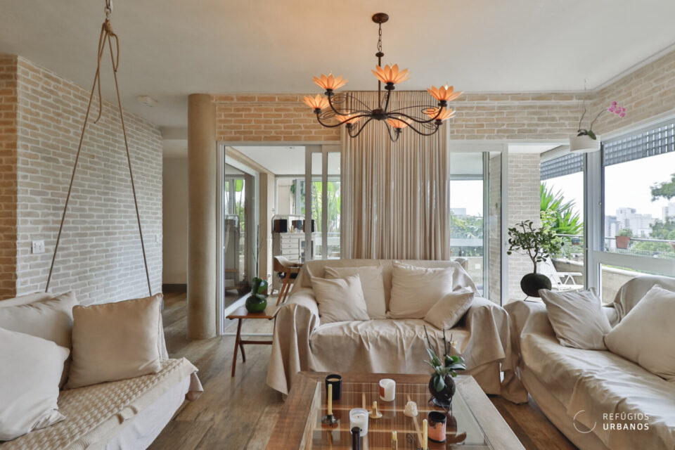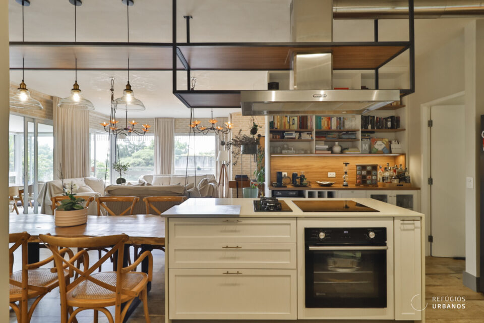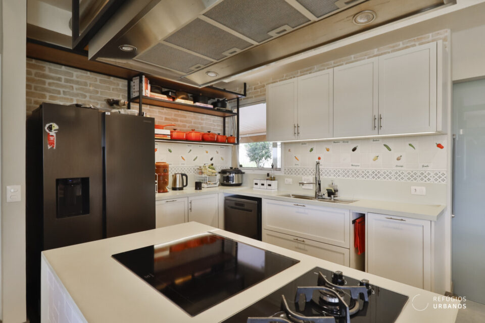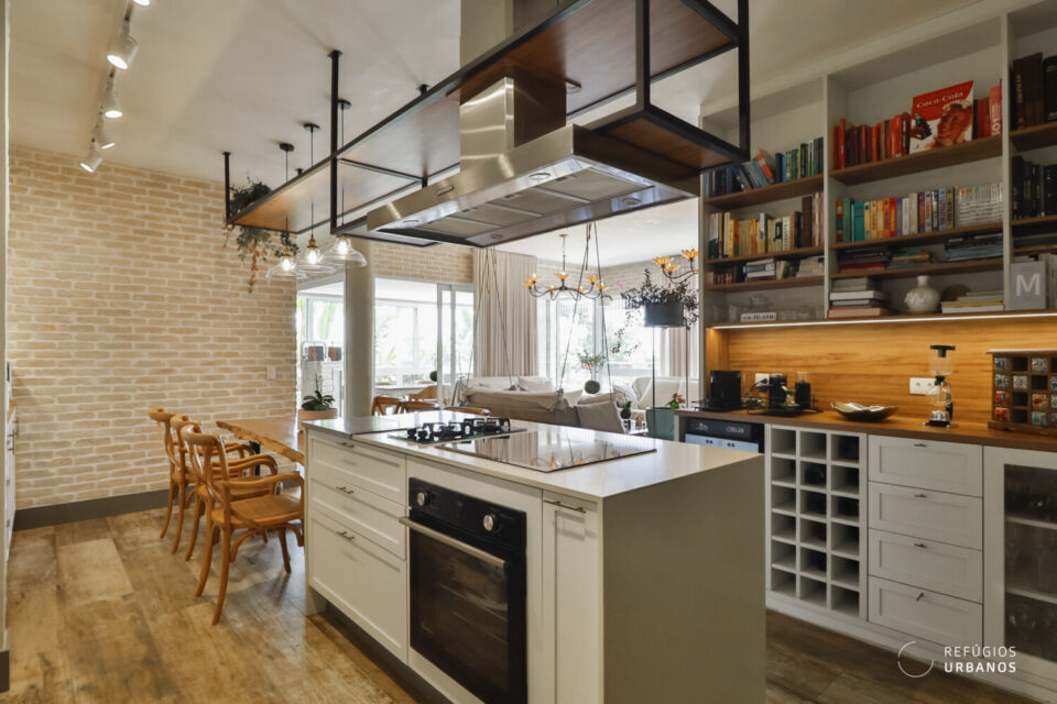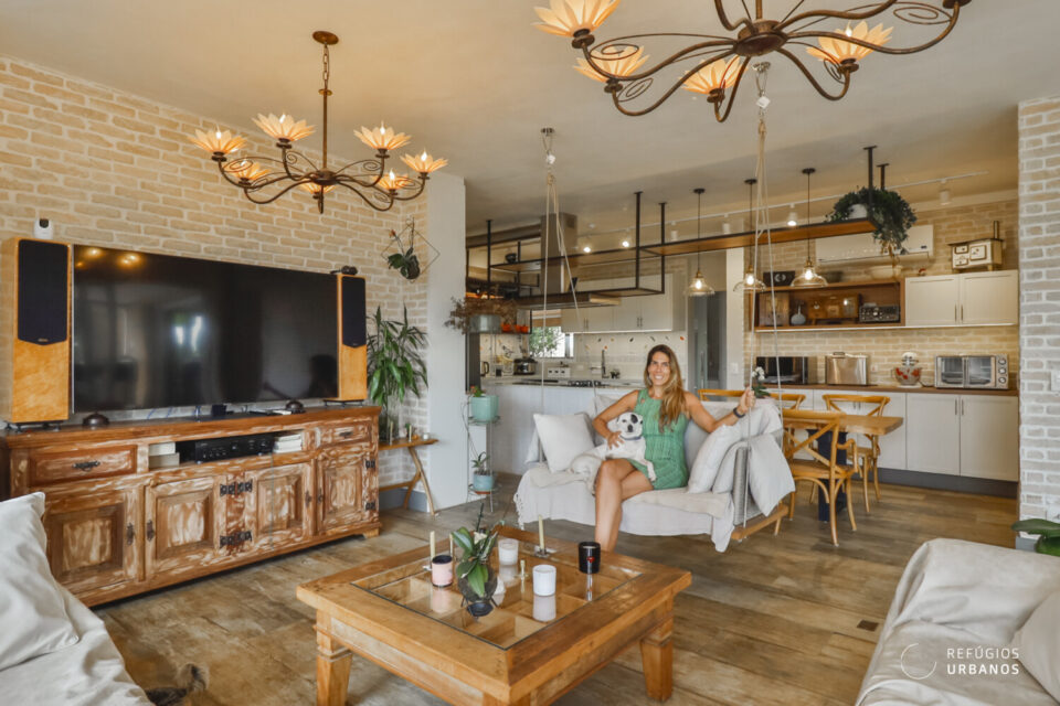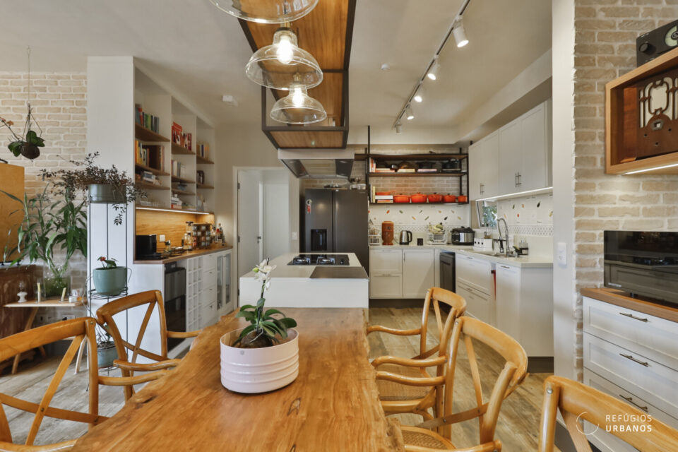 Outra característica que confere uma alma de casa para esse imóvel, é o revestimento de tijolinho claro em todo o living. O estar está integrado com a cozinha, onde já há uma ilha com cooktop, forno e coifa, além de mesa e marcenaria impecável. Aliás, vários itens de mobília e eletrodomésticos ficam no imóvel na venda.