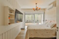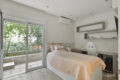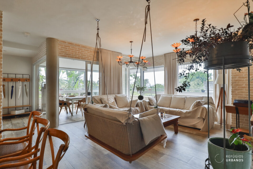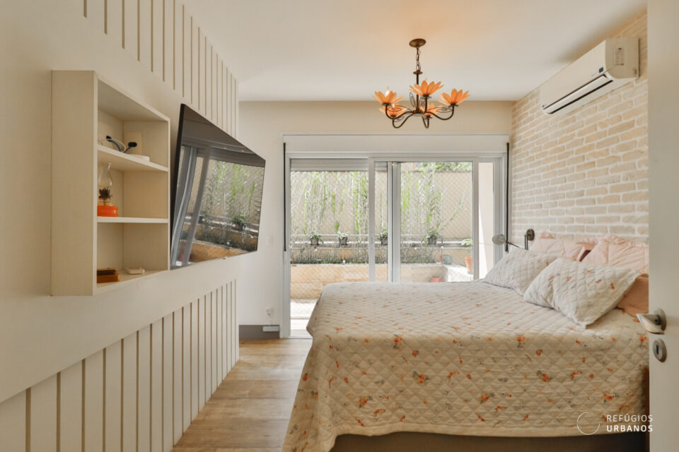 Na área íntima, os três dormitórios da planta original foram transformados em duas suítes, uma delas com closet. Ambas contam com ar- condicionado e portas de correr para o lado de fora, formando assim um espaço de quintal privativo, onde hoje há uma horta e rede: o cantinho especial para o descanso!