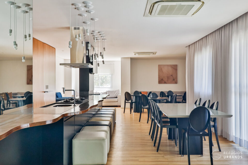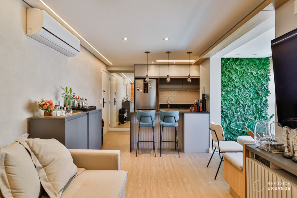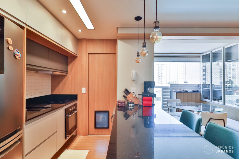 Além disso, o projeto integra os ambientes, e a cozinha se apresenta totalmente equipada, com marcenaria planejada, enquanto uma bancada em granito preto absoluto separa o living.