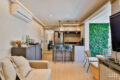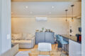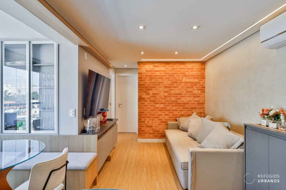 Por fim, a sala de estar oferece uma TV de 65 polegadas, sofá Bazzi, ampla marcenaria e ar-condicionado que atende toda a integração do living.