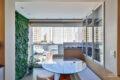 Na sequência, a varanda se integra ao conjunto e possui um jardim vertical preservado. A mesa de jantar, feita de madeira maciça, acompanha cadeiras também assinadas por Fernando Jaeger. O fechamento em cortina de vidro já está instalado.