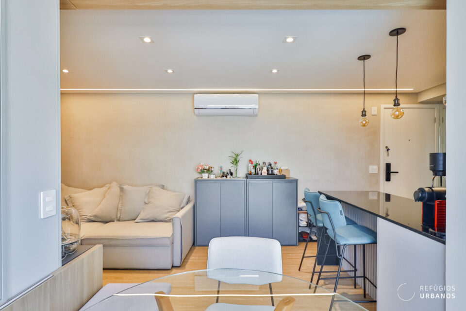 Os ambientes possuem tons neutros e o piso é vinílico Tarkett amadeirado. As banquetas, por sua vez, levam a assinatura de Fernando Jaeger.
