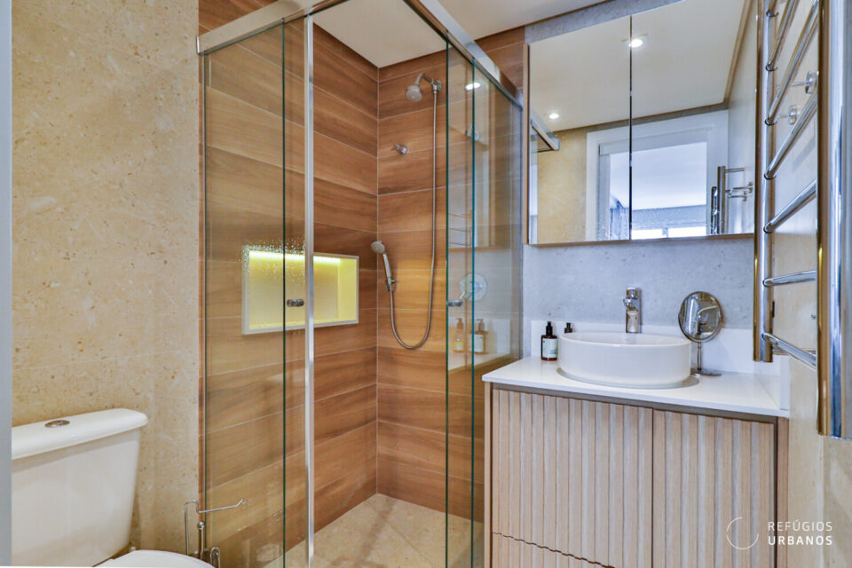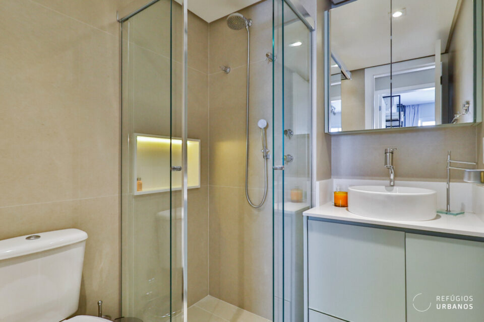 Além disso, o banheiro da suíte está completo, com revestimentos Portobello, armários, louças e metais Deca, toalheiro elétrico e ótimo tamanho.
