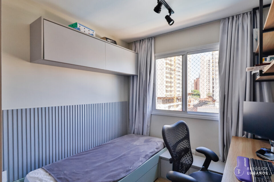 Na sequência, um dos dormitórios apresenta janela ampla, que permite a entrada abundante de luz natural, além de oferecer marcenaria completa, cama, bancada de trabalho e ar-condicionado, atendendo perfeitamente como escritório e quarto de visitas.