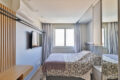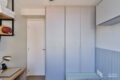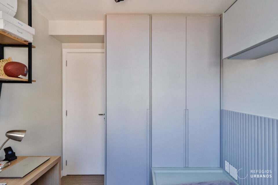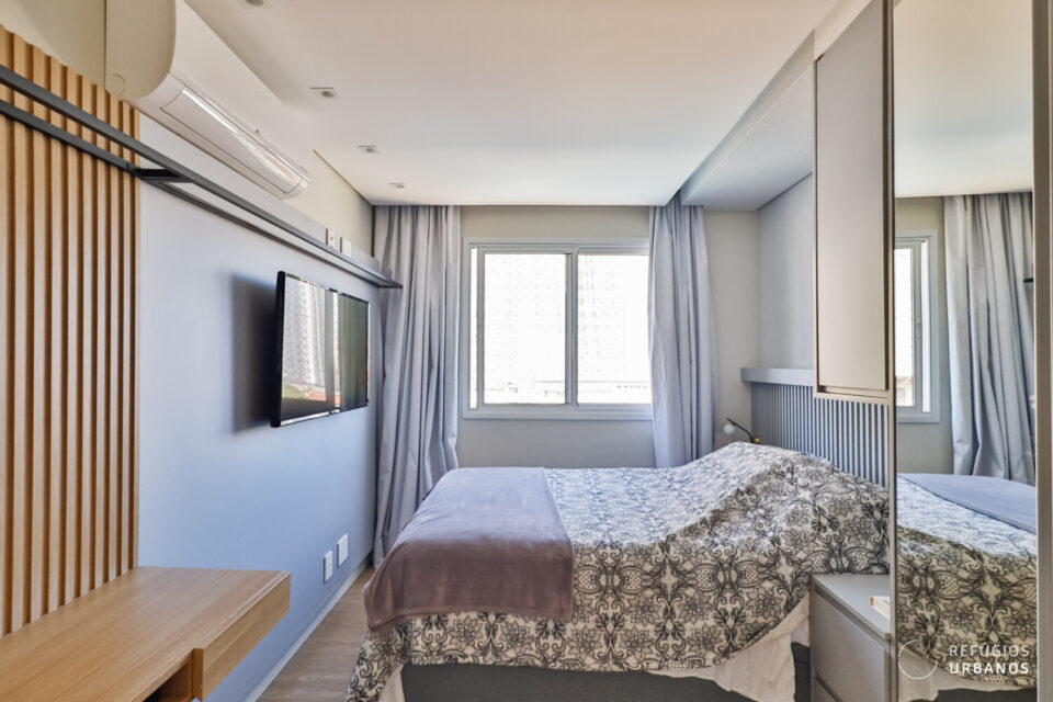 Em seguida, ao chegar à suíte, o ambiente oferece bom espaço de circulação, enquanto o painel ripado em tom cinza na parede da cama traz conforto e elegância. Os armários são generosos, e o espaço ainda conta com bancada de trabalho, TV e ar-condicionado.