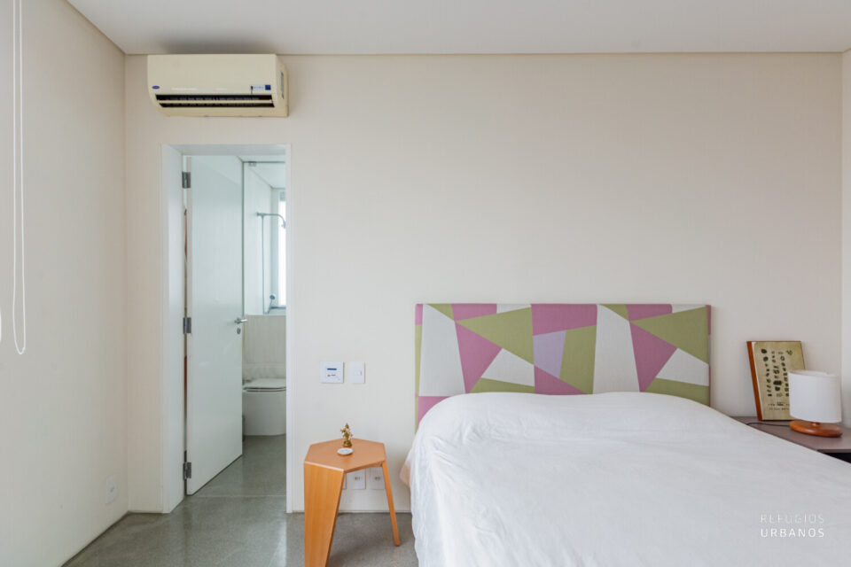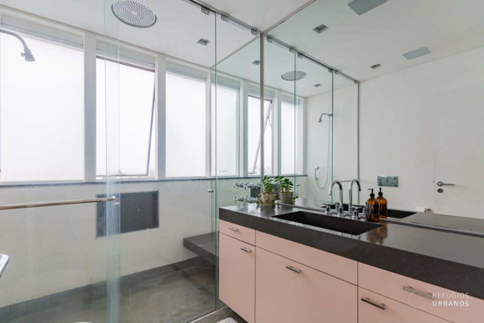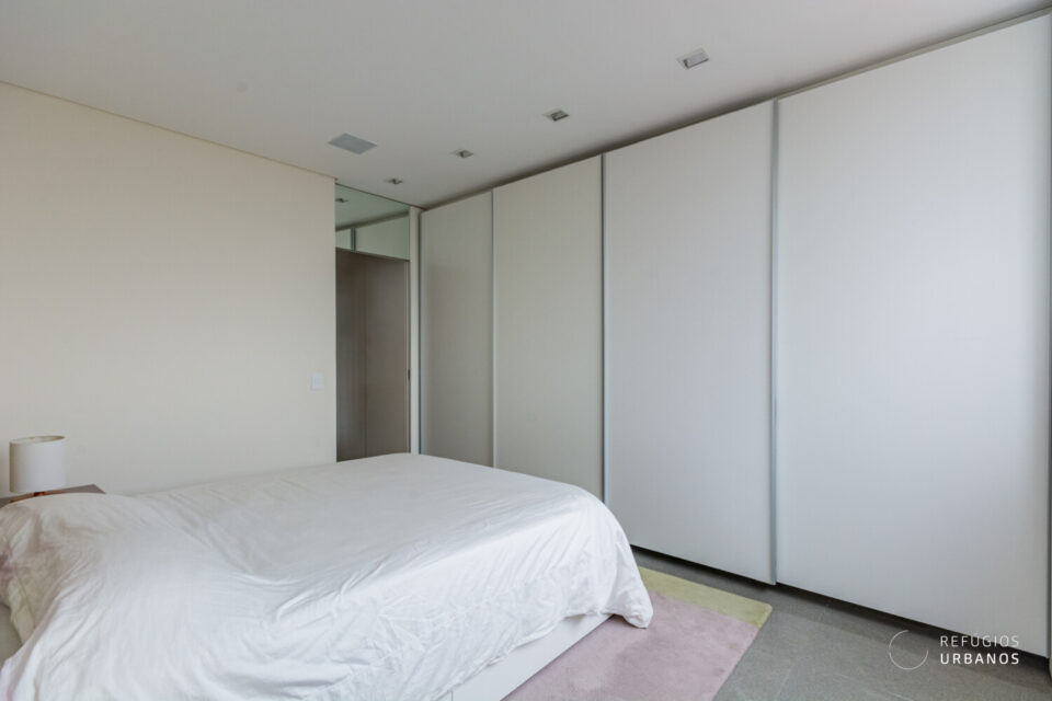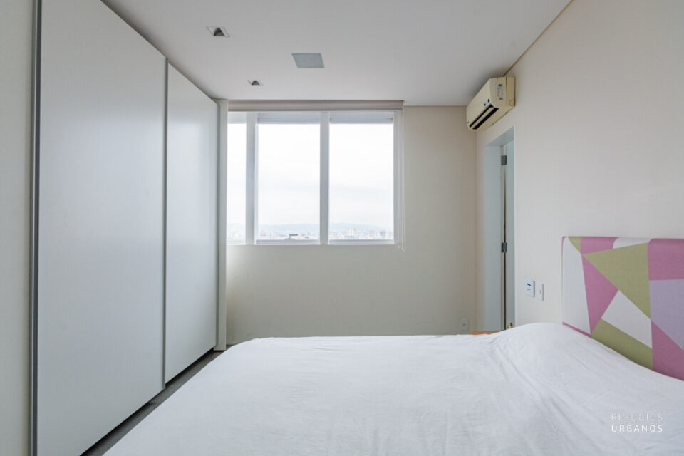 A suíte surpreende pela luz natural, armários sob medida e um banheiro elegante, com acabamentos de excelente qualidade.