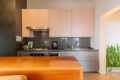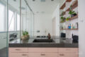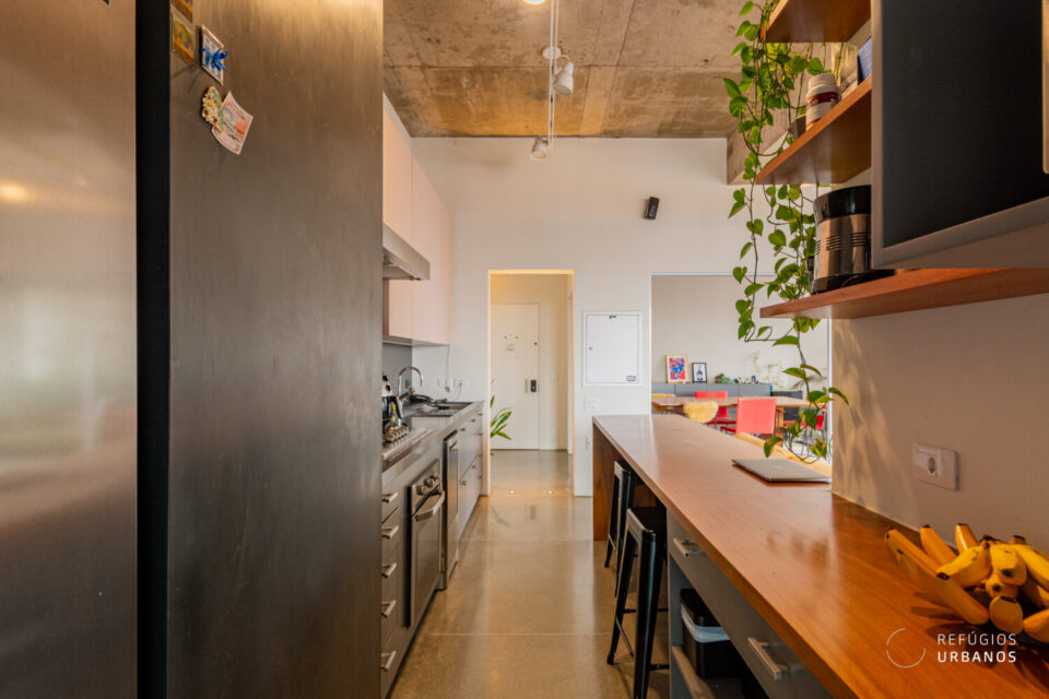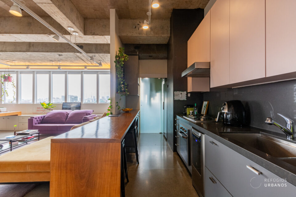 A cozinha americana segue o mesmo conceito de integração: equipada com planejados de alto padrão e bancada funcional, permite cozinhar e socializar ao mesmo tempo, mantendo o ambiente organizado e sofisticado.