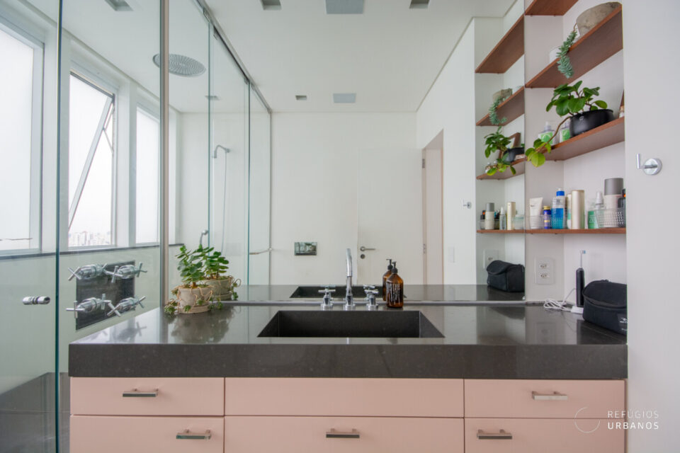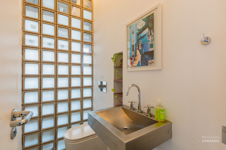 O lavabo é um acontecimento à parte: moderno, com cobogó e vidro fosco — uma combinação que traz leveza ao ambiente e preserva a privacidade da área íntima.