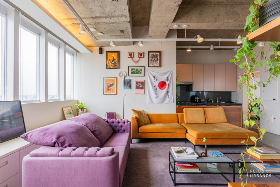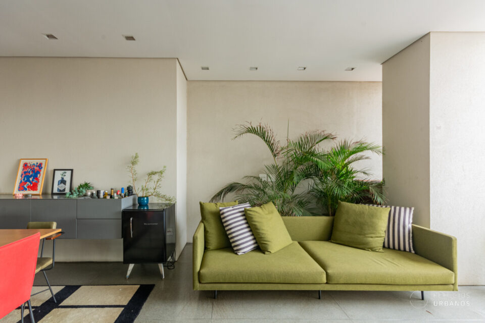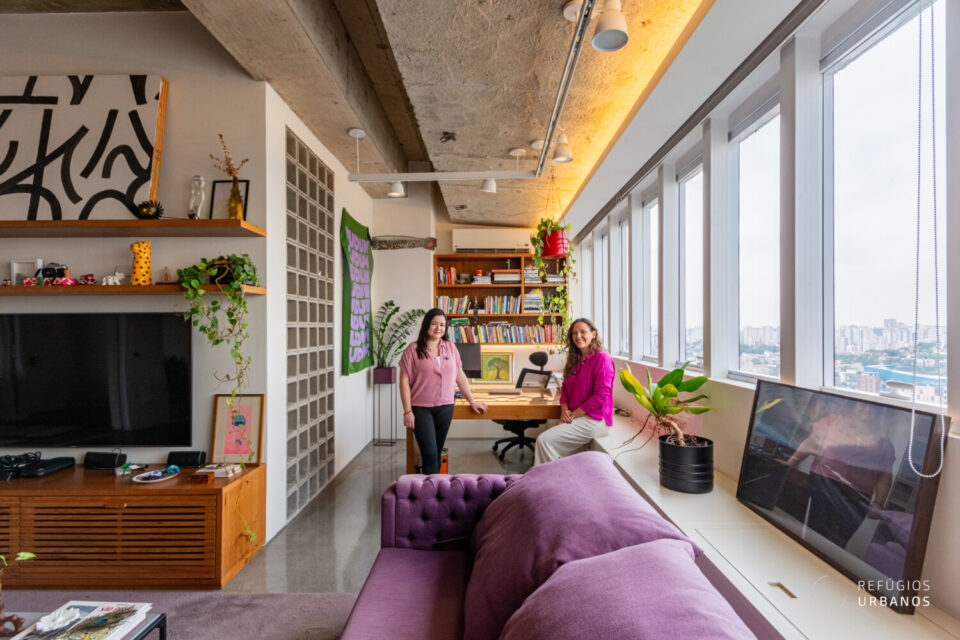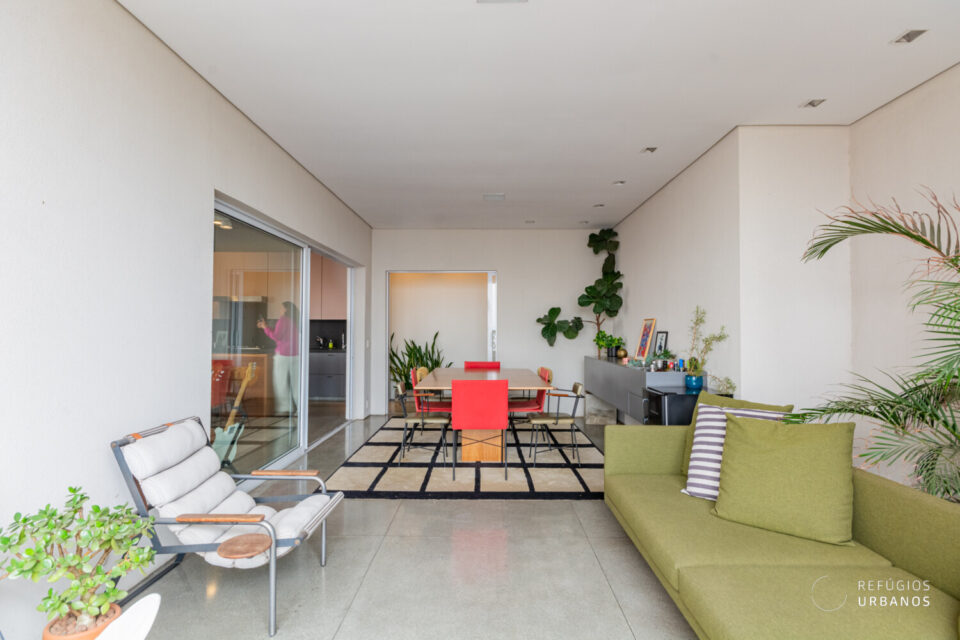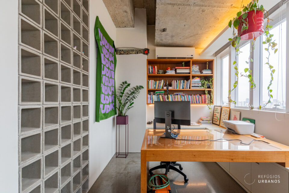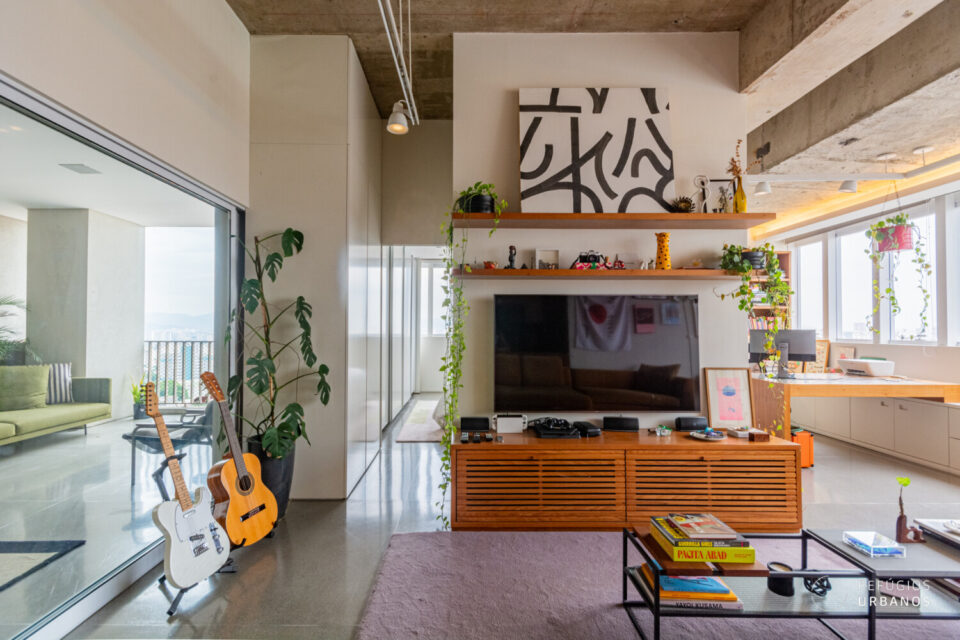 Integrada à varanda, a sala de estar se distribui entre home office, espaço de descanso e convivência.