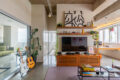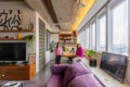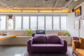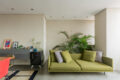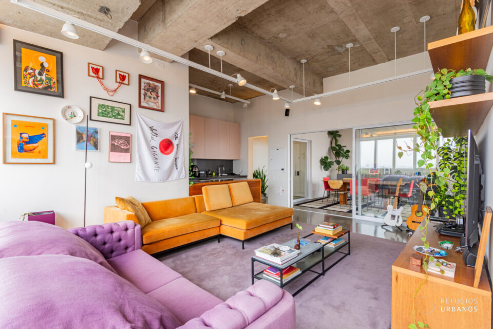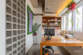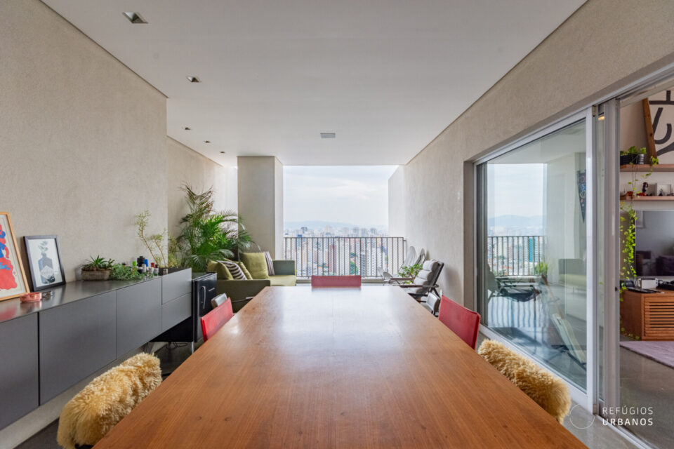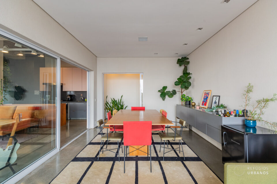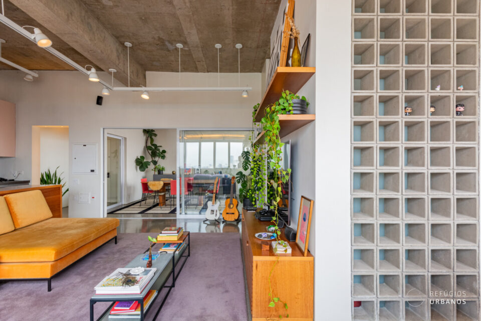 O concreto aparente no teto acrescenta personalidade e reforça a estética premiada do projeto, além de ampliar a luminosidade e favorecer a ventilação cruzada.