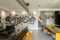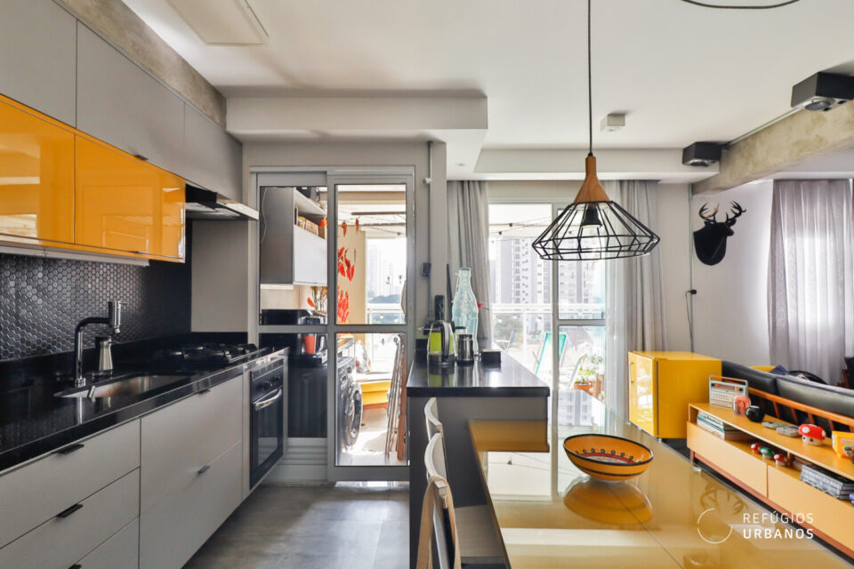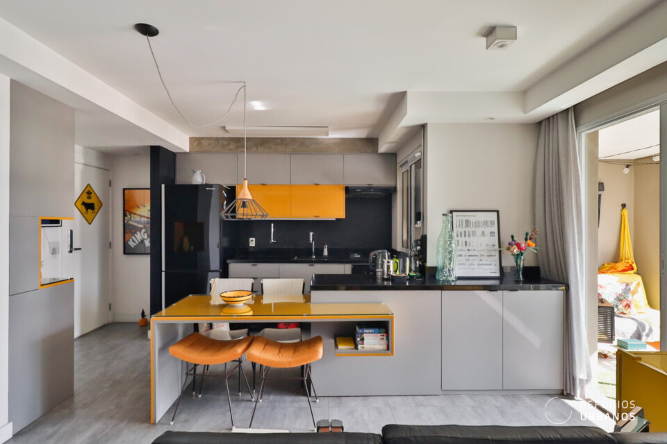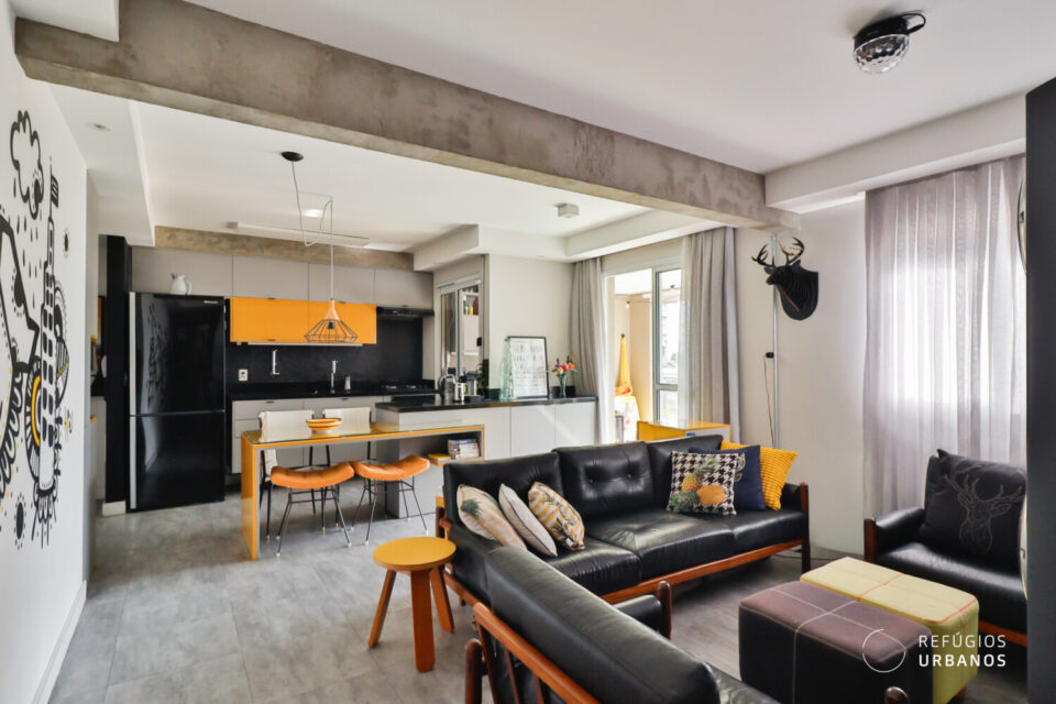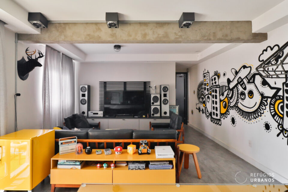 Primeiramente, a sensação da vibe urbana está presente desde a entrada no ape. As cores utilizadas no mobiliário, a decoração e o grafite dão um toque contemporâneo, a esse apartamento cheio de estilo em todos os detalhes.
