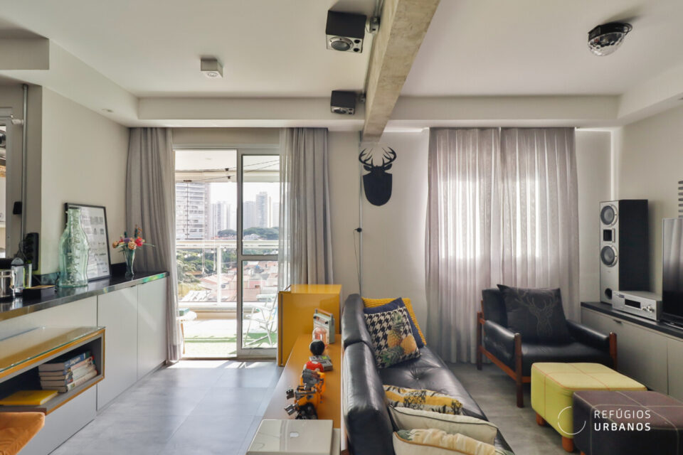 Esse apartamento na Pompeia, cuja planta original contava com dois dormitórios, passou por uma reforma, na qual foi suprimido um dormitório para priorizar a integração e amplitude da área social.