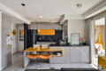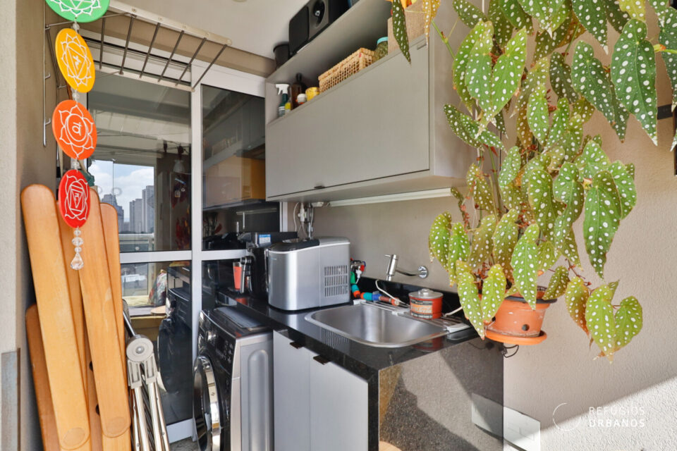 A lavanderia, logo ao lado da cozinha, possui quantidade suficiente de armário para manter a casa organizada e trazer praticidade ao dia a dia.