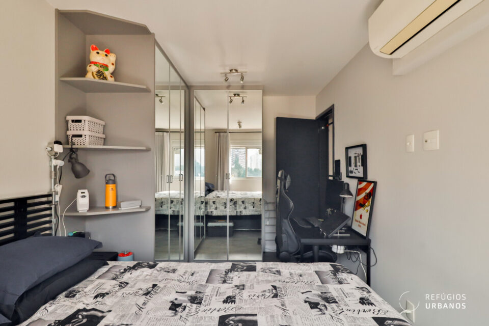Na área íntima, tem uma suíte, que acomoda tranquilamente uma cama queen-size e conta com um ótimo guarda-roupa planejado, com espelho nas portas.