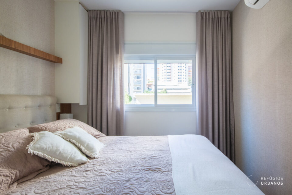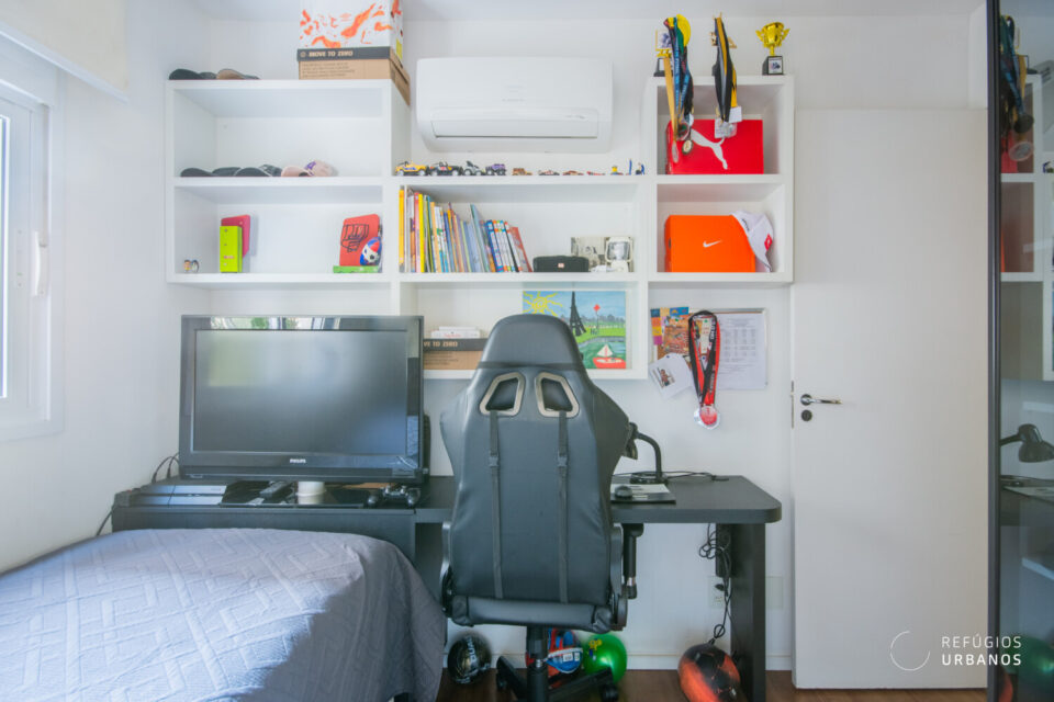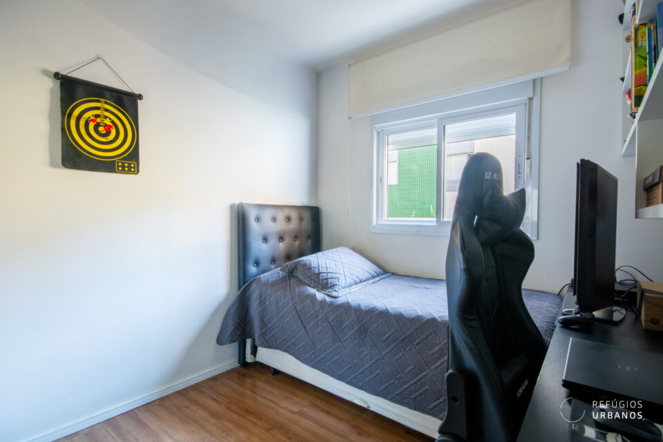 A suíte é confortável e funcional, com móveis sob medida e excelente aproveitamento de espaço, enquanto o segundo dormitório segue o mesmo padrão de planejamento e organização.
