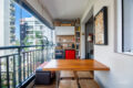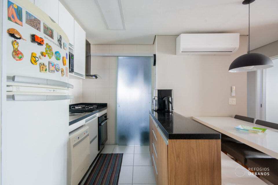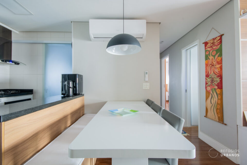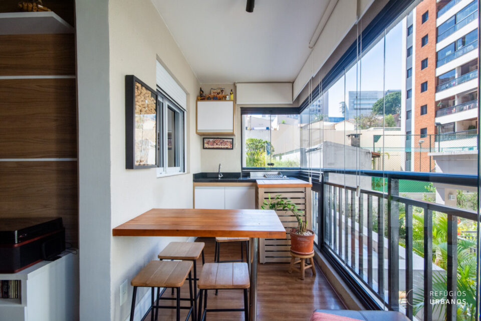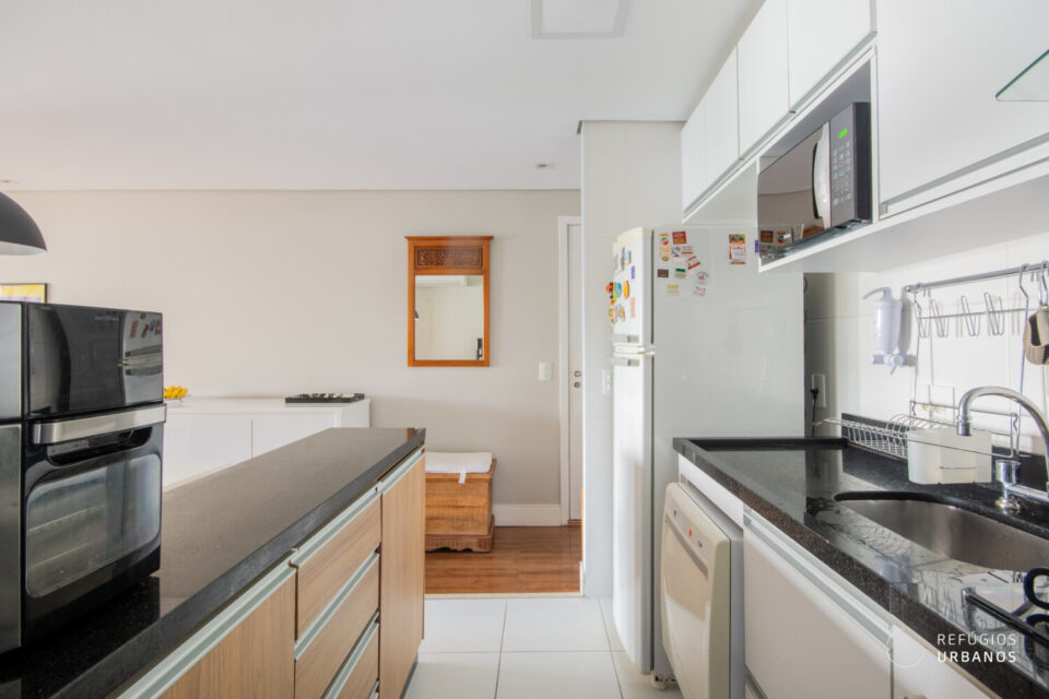 Essa integração traz a sensação de morar em uma casa térrea, cercada pelo verde, mesmo estando no coração da cidade.