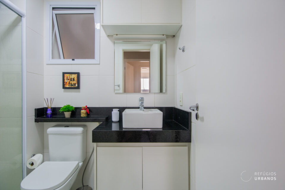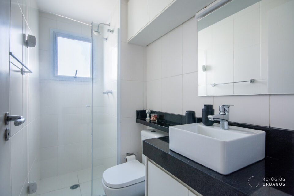 Além disso, o apartamento conta com ar-condicionado, chuveiro a gás e área de serviço com armários, garantindo praticidade no dia a dia.