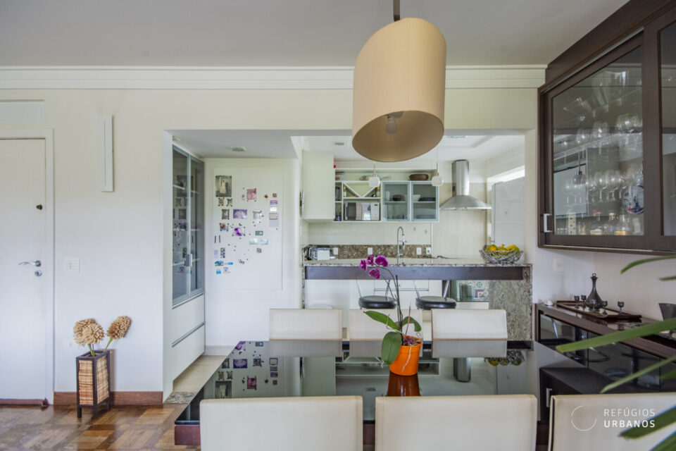 Como resultado, a sala, integrada à cozinha e a um dos antigos quartos, agora abriga três espaços amplos; estar, jantar e TV, além de um generoso espaço para escritório, ideal para o trabalho remoto.