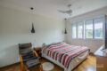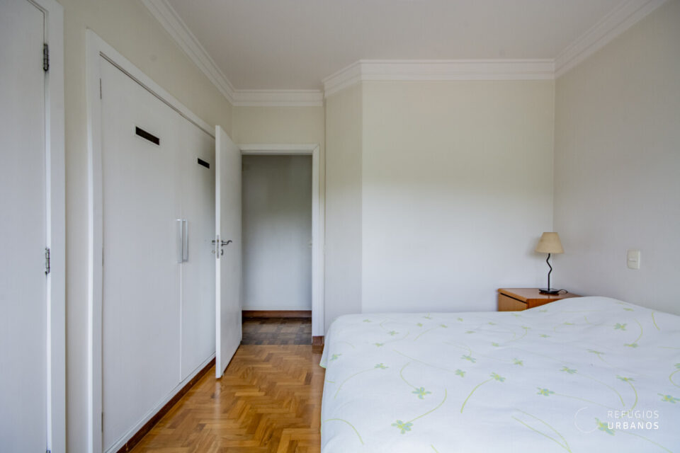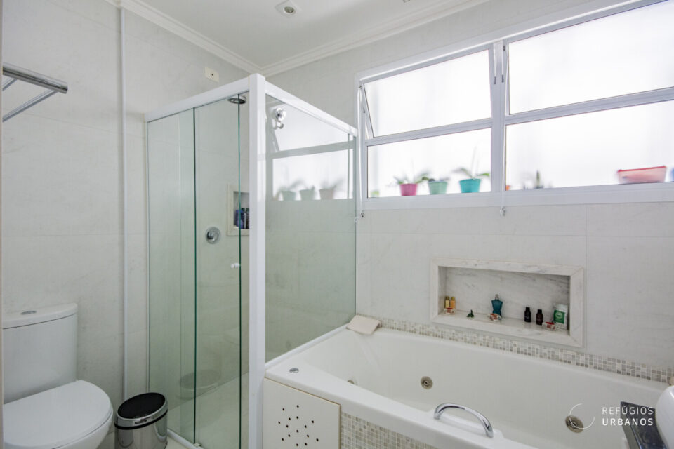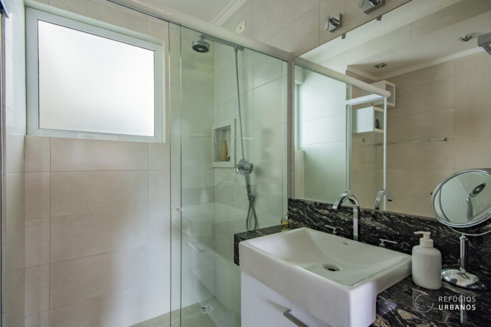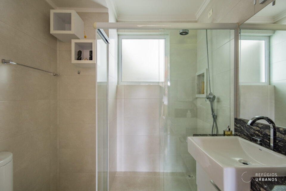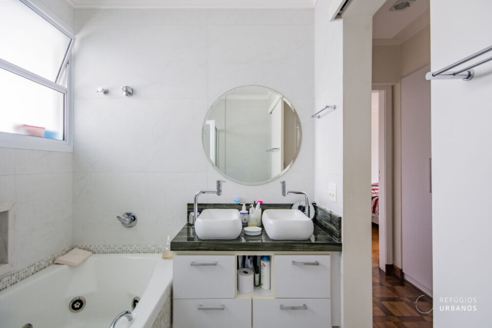A partir dele, chegamos aos dois dormitórios, onde a luz natural é abundante. O primeiro, claro e ventilado, conta com armários embutidos e é atendido por um banheiro social completo. Já o segundo, é uma suíte ampla, com closet e banheira que convidam ao relaxamento. Por isso, a área íntima deste apartamento se tornou um verdadeiro refúgio dentro da cidade.