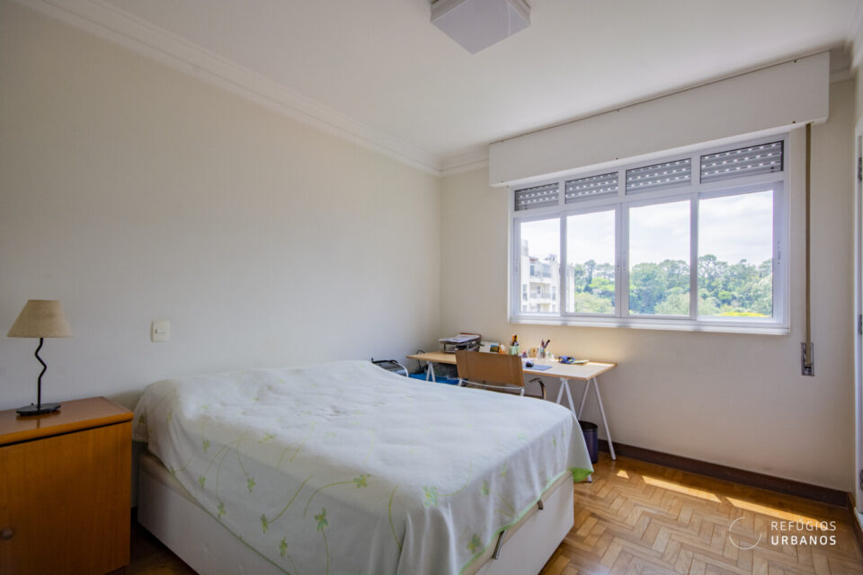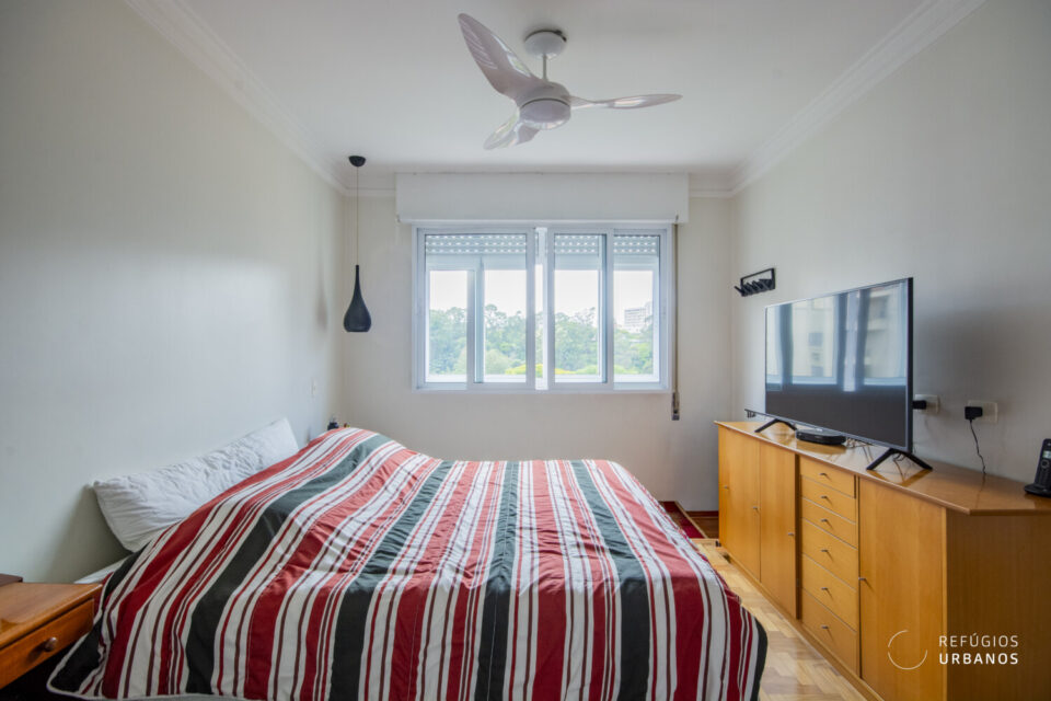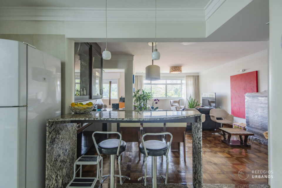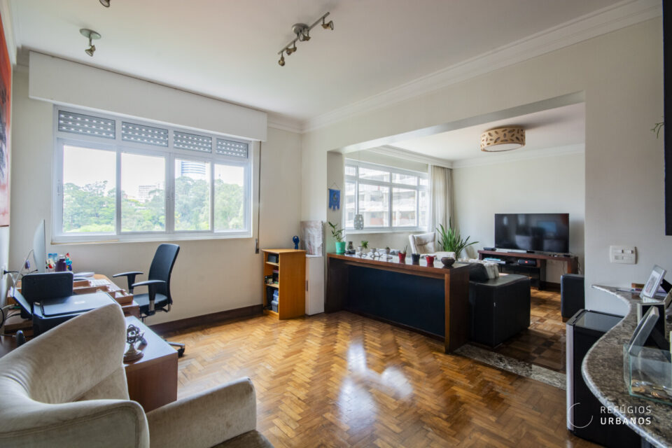 Apartamento reformado na Rua Oscar Freire, em Pinheiros, com 152 m², 2 quartos (1 suíte com banheira), 1 vaga de garagem, andar alto e vista para o bosque do Clube dos Médicos.