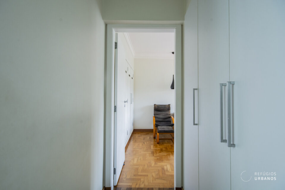 O antigo corredor foi reinventado e, assim, ganhou nova função com uma rouparia sob medida. A partir daí, o acesso à área íntima acontece pelo espaço office, criado no lugar do terceiro quarto. Dessa forma, o layout ficou mais funcional e leve.