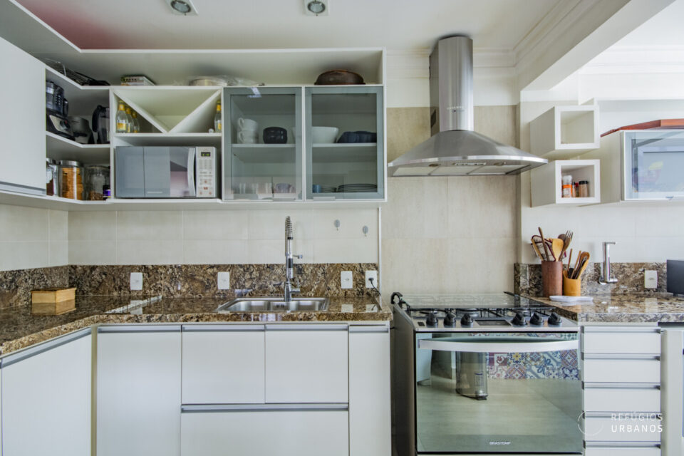 Na cozinha, o projeto aposta no branco e na leveza. Por isso, cada detalhe simplifica a rotina: gavetas, armários e bancadas bem posicionados otimizam o espaço e mantém o ambiente sempre organizado.
