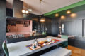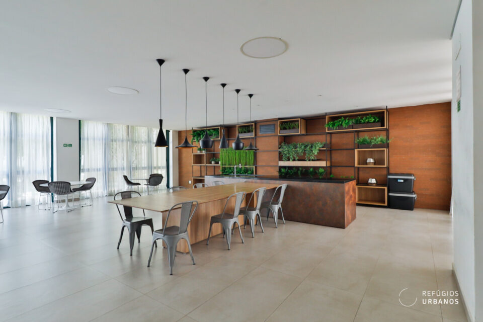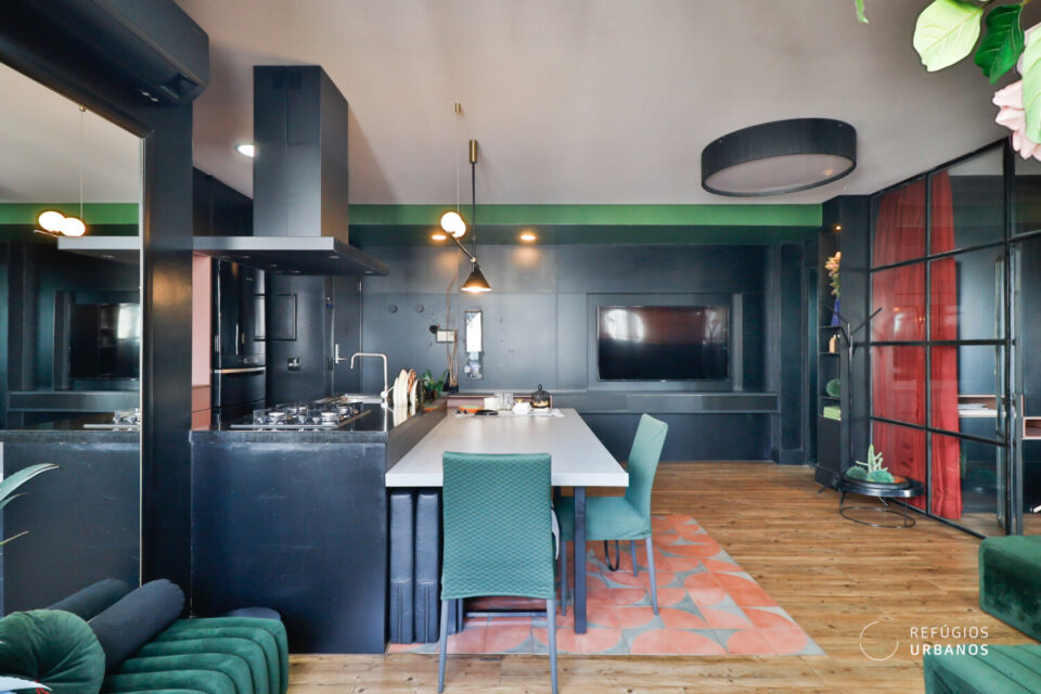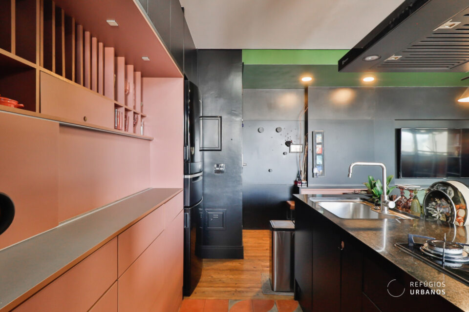 O ponto de água foi reposicionado para que a pia e o cooktop fiquem voltados para a bancada, integrada a uma generosa mesa. Dessa forma, a cozinha se transforma em palco de encontros, onde a arte de cozinhar se une ao prazer de receber.