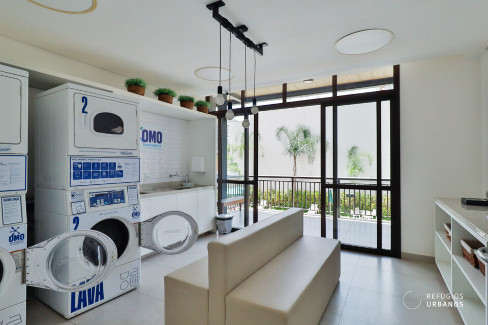 A área de serviço é integrada e praticamente imperceptível, com marcenaria funcional que mantém o visual limpo e organizado.