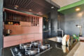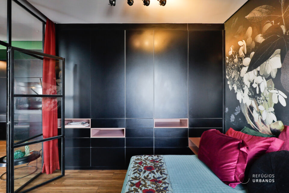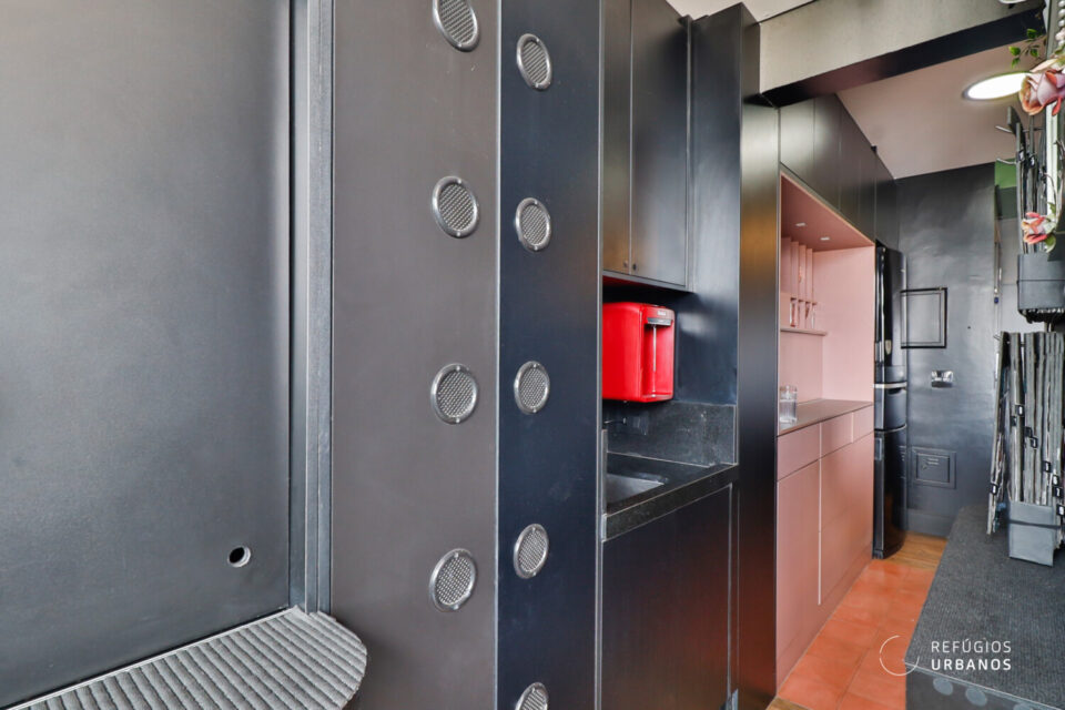 A marcenaria planejada organiza o apartamento, ajudando a manter a estética contemporânea, descolada e cheia de personalidade. Além das portas dos armários serem com o sistema Fecho Toque, os eletrodomésticos ficam em posição discreta com sistema gaveta.