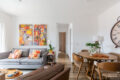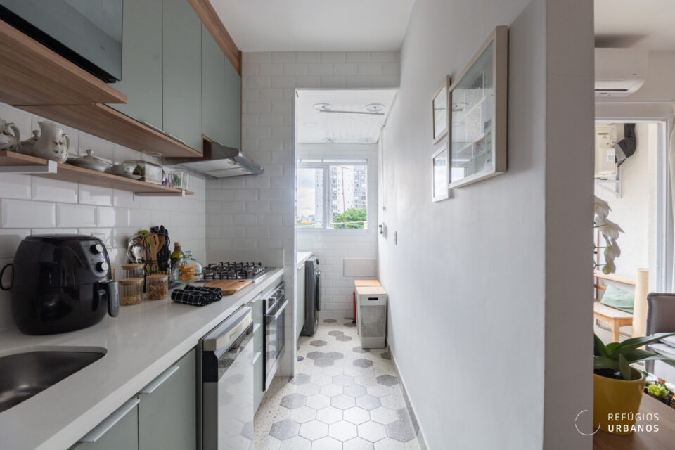 Além disso, o fechamento em vidro amplia a área social e aumenta a luminosidade. Ao entrar, a sensação é de praticidade no dia a dia. Ao mesmo tempo, o acabamento combina piso em porcelanato integrado com marcenaria planejada. Na cozinha e na lavanderia, por sua vez, a reforma trouxe revestimento estilo metrô white; assim, o visual ficou atual e funcional.