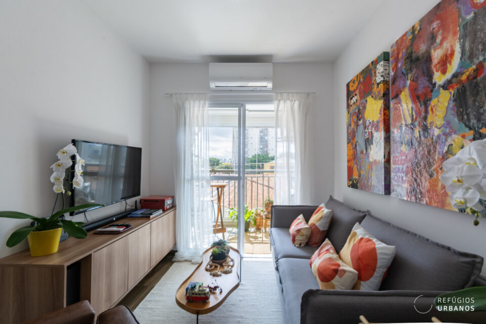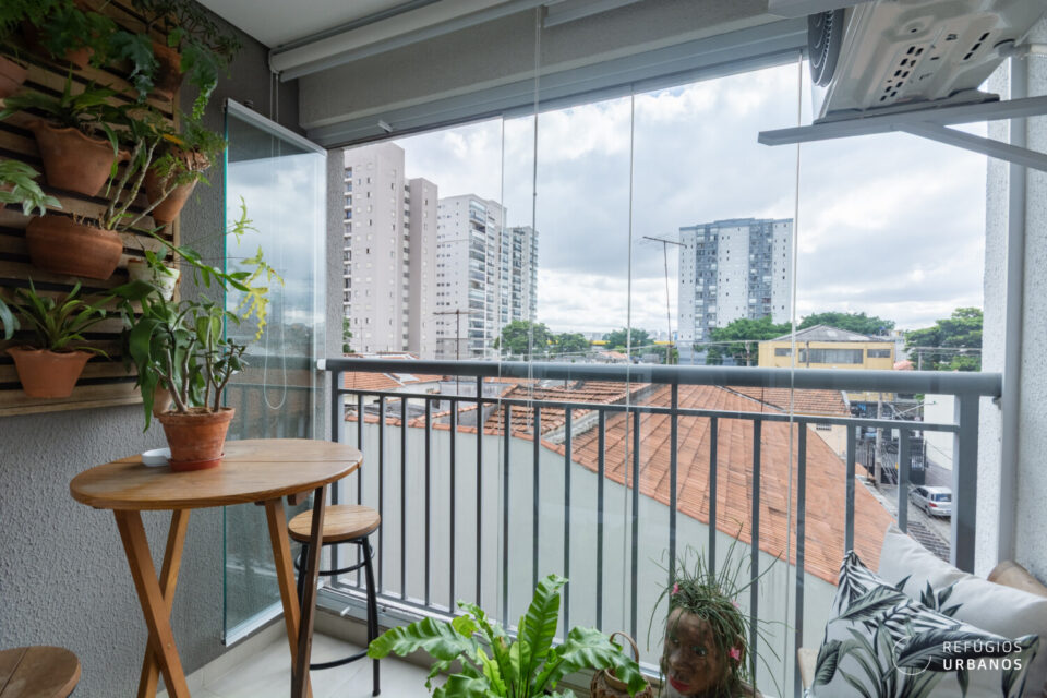 Um dos grandes destaques deste apartamento no Ipiranga é a varanda. Integrada à sala, ela amplia o convívio e melhora o aproveitamento do espaço. Além disso, as portas de vidro organizam os ambientes sem bloquear a claridade. Dessa forma, luz e ventilação circulam melhor.