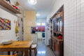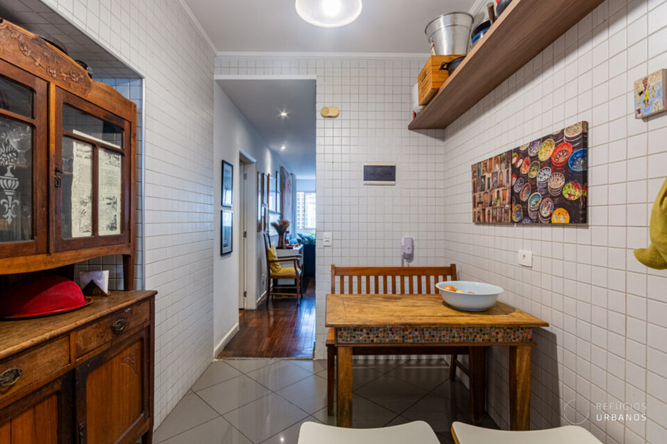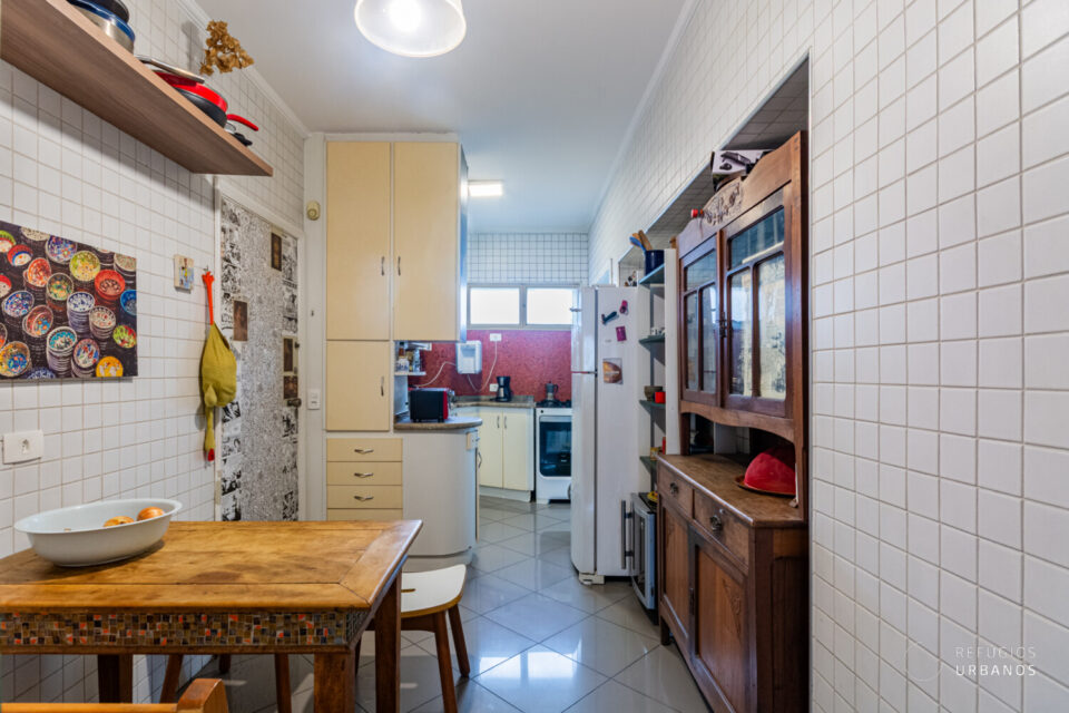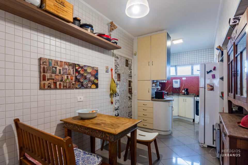 A cozinha é funcional e possui um bom aproveitamento de espaço, incluindo uma mesinha para pequenas refeições. Além disso, tem uma boa área de serviço completa de aquecedor a gás e um banheiro.